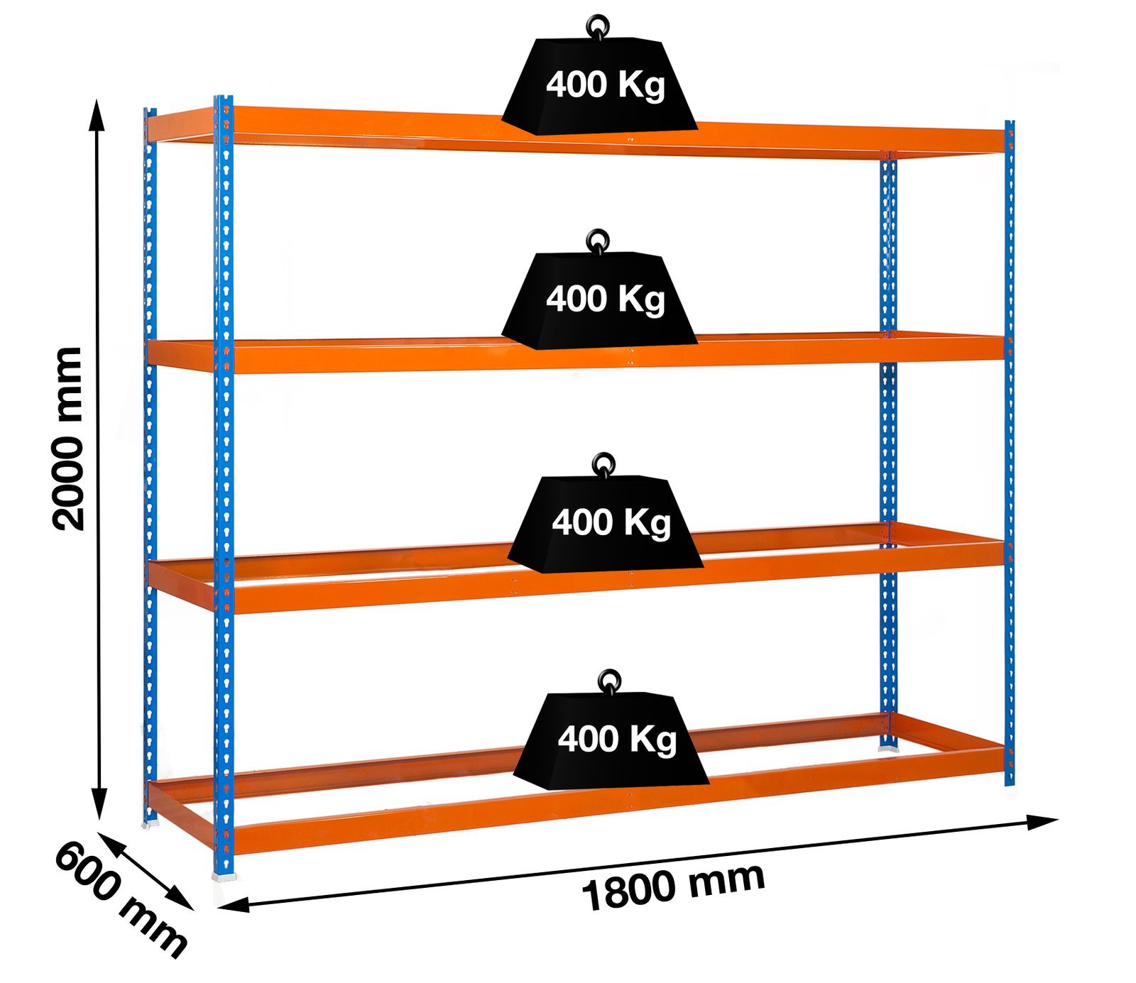 Estanteria metalica sin tornillos con 4 estantes. No contiene ni bandejas de aglomerado ni bandejas de metal. Estanteria que se monta de forma facil y comoda gracias a su sistema de click, sin tornillos simplemente con la ayuda de un martillo podras tener esta estanteria montada en unos minutos. Tienes a tu disposicion un video detallado de montaje en Youtube. La capacidad de carga de cada uno de los estantes es de 400 kgs. Contiene 1 refuerzo por estante. Contiene un recubrimiento plastico y acaaseo en epoxypoliester. Ademas es muy facil de limpiar. Manipulacion del producto sin aristas de corte, sin riesgos de manipulacion. Es un producto fabricado en Europa por Simonrack. Medidas en uso del producto, 1975x1810x610 mm