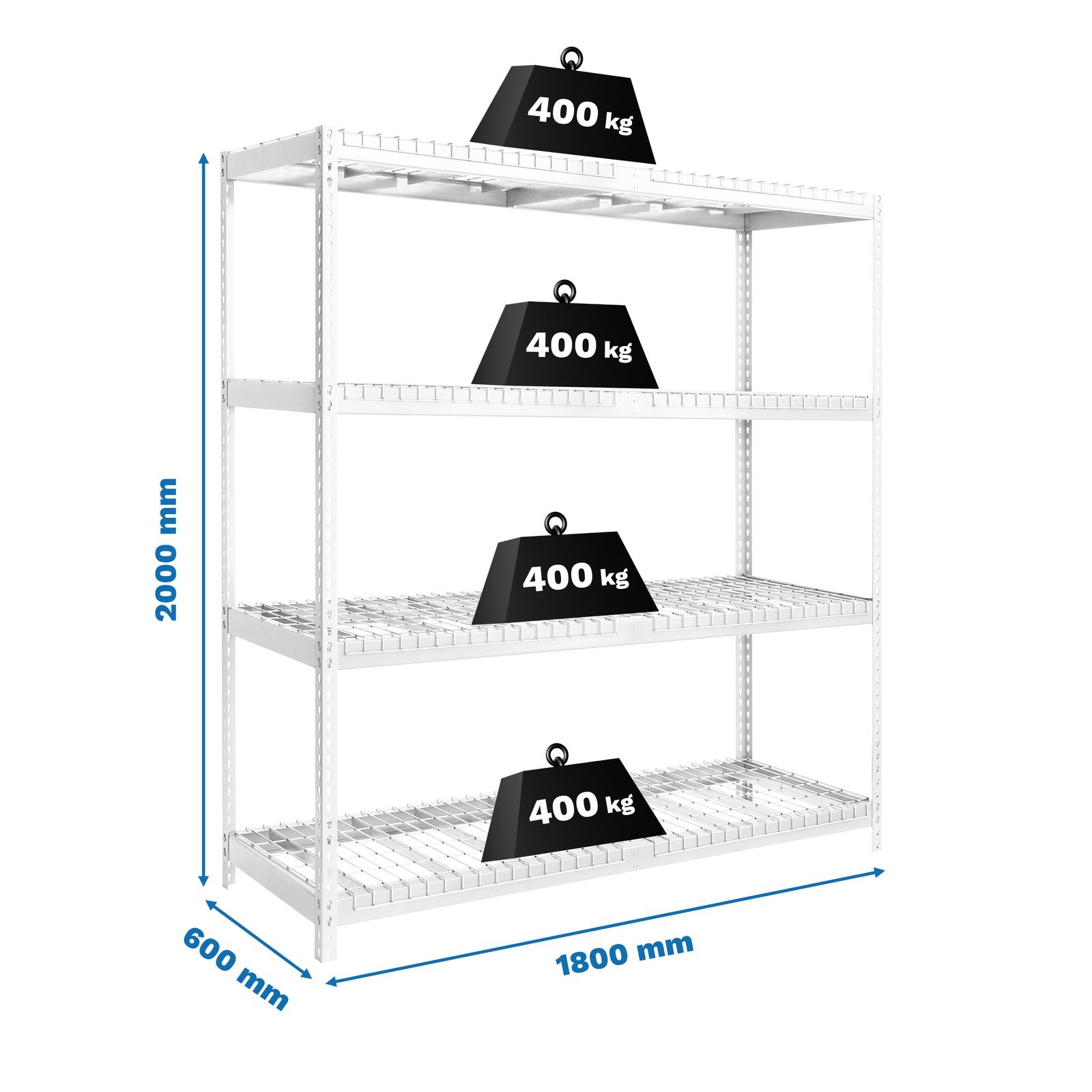 Estanteria media carga sin tornillos Ecoforte REX 2000x1800x600 mm. de color blanco. La capacidad de carga es de 400 kgs. Incluye rejillas metalicas. Y tiene 4 estantes. Se monta sin tornillos muy rapido siguiendo las instrucciones. Medidas en uso del producto, 1975x1810x610 mm
