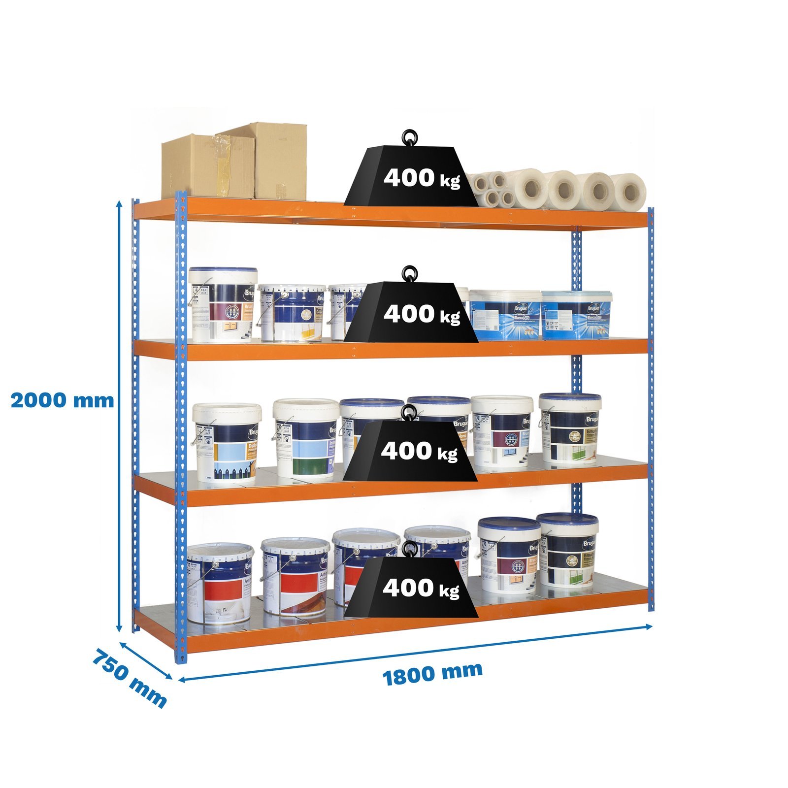 Estanteria metalica sin tornillos de color AZUL/NARANJA/GALVA con capacidad de carga por estante de 400 kg. El numero de estantes es 4 y las medidas (alto x ancho x fondo) son 2000x1800x750 mm. Incluye estantes de metal. Producto europeo, calidad europea, podras encontrar las instrucciones de montaje en su interior o en este enlace, https, //www. youtube. com/watch?v=Q84CvDjhQ6Y. Medidas en uso del producto, 1975x1810x760 mm