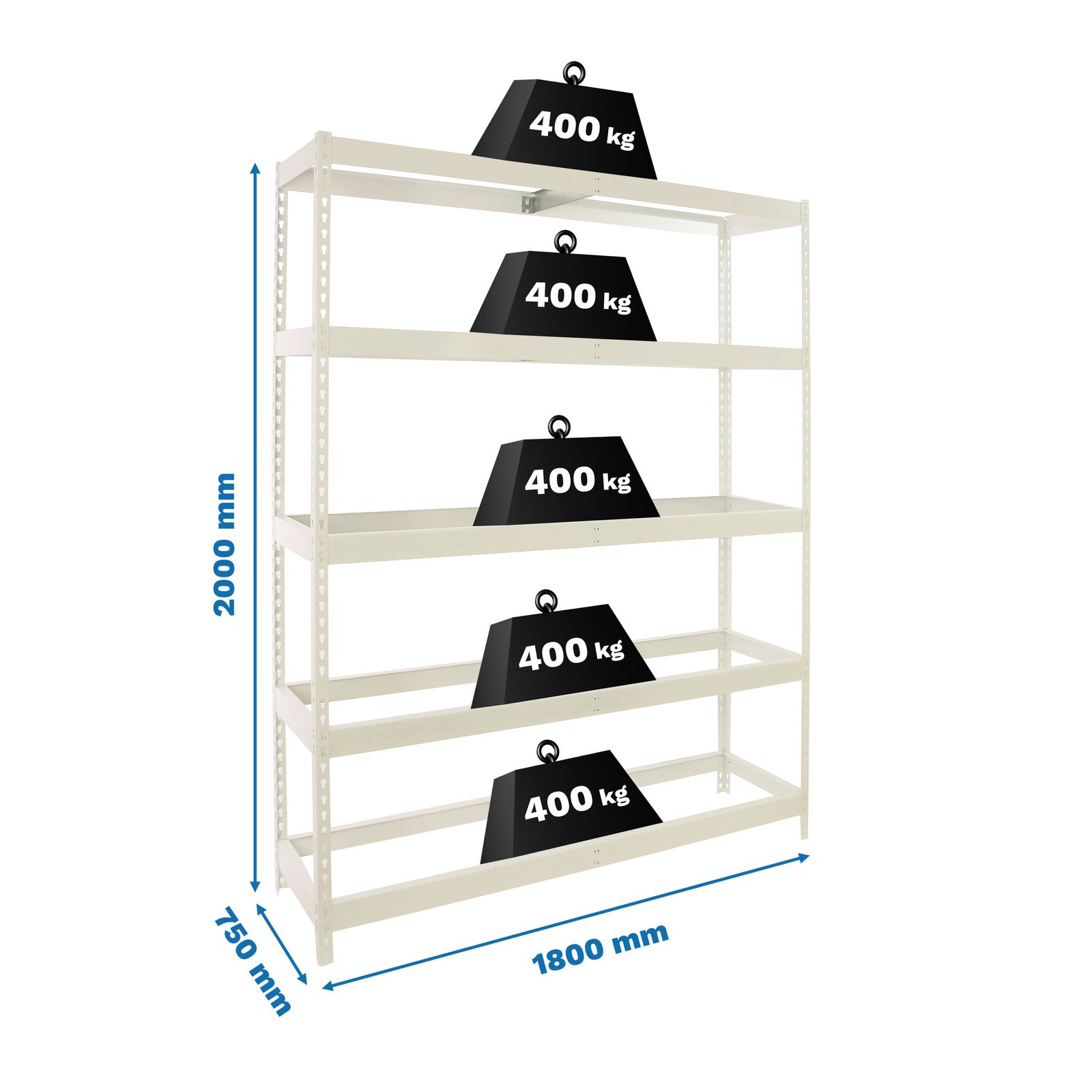 Estanteria media carga sin tornillos Ecoforte 2000x1800x750 mm. de color blanco. La capacidad de carga es de 400 kgs. No Incluye bandejas de metal, ni aglomerado. Y tiene 5 estantes