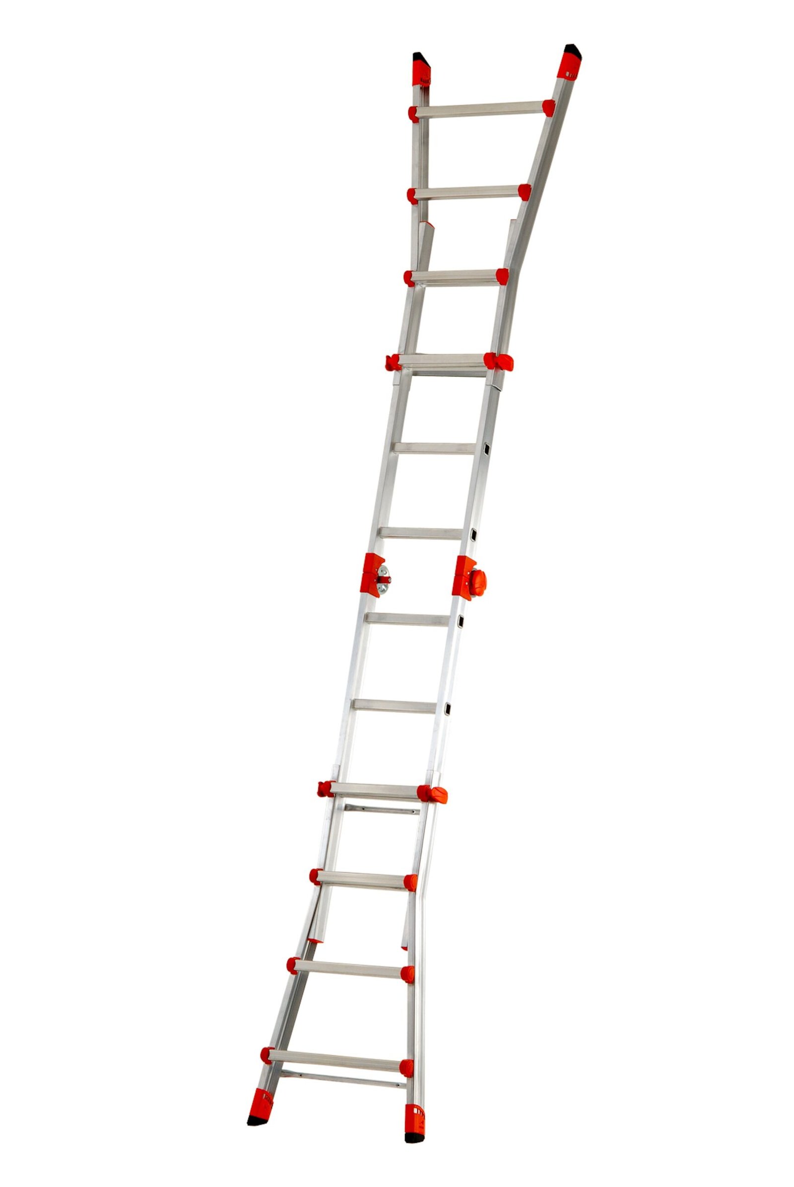 Escalera muy versátil gracias a sus múltiples configuraciones de uso: 4 escaleras en 1 sola. Súper compacta cuando está cerrada, perfecta para transportar en el maletero del coche. Su fabricación en aluminio la hacen ligera y manejable. Certificada según la normativa EN131-4 con capacidad garantizada de 150 kg de carga. Estructura sólida de aluminio reforzado para mayor resistencia a la torsión y a la carga. Grandes largueros de 60×22 mm con perfil redondeado para un agarre más confortable. Sistema patentado de articulación de acero con manopla de diseño innovador y ergonómico. Sistema de seguridad semiautomático que bloquea la bisagra y evita la apertura o cierre de la escalera. Peldaños de 30×30 mm fijados con 3 puntos de soldadura en cada lado. Tacos de dos componentes que aseguran la máxima adherencia al terreno. Gran gancho lateral de acero recubierto de plástico.