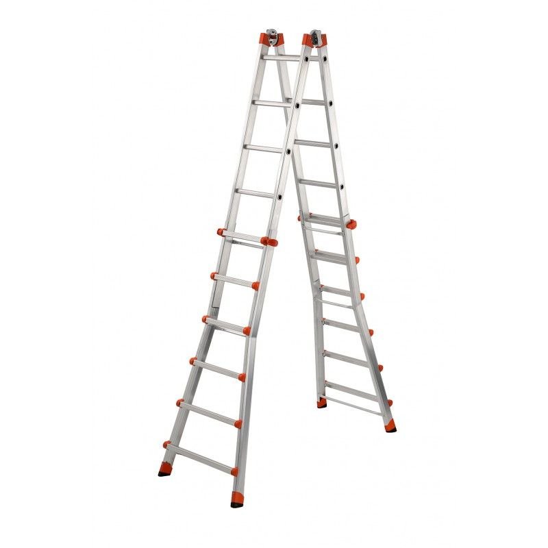 Escalera muy versátil gracias a sus múltiples configuraciones de uso: 4 escaleras en 1 sola. Súper compacta cuando está cerrada, perfecta para transportar en el maletero del coche. Su fabricación en aluminio la hacen ligera y manejable. Certificada según la normativa EN131-4 con capacidad garantizada de 150 kg de carga. Estructura sólida de aluminio reforzado para mayor resistencia a la torsión y a la carga. Grandes largueros de 60×22 mm con perfil redondeado para un agarre más confortable. Sistema patentado de articulación de acero con manopla de diseño innovador y ergonómico. Sistema de seguridad semiautomático que bloquea la bisagra y evita la apertura o cierre de la escalera. Peldaños de 30×30 mm fijados con 3 puntos de soldadura en cada lado. Tacos de dos componentes que aseguran la máxima adherencia al terreno. Gran gancho lateral de acero recubierto de plástico.
