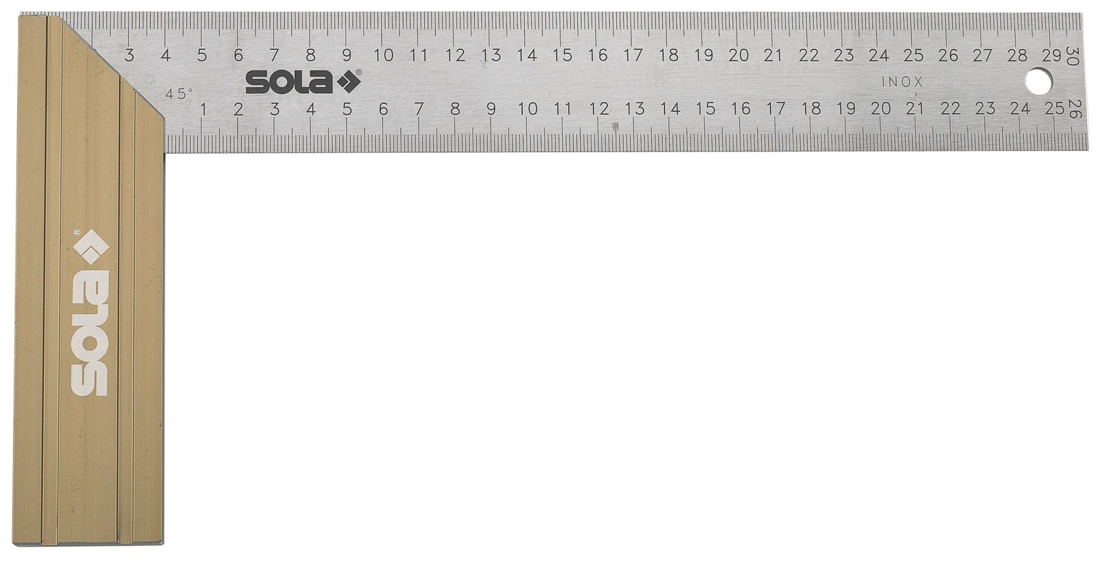 Hoja de acero inoxidable templada. Mango aluminio anodizado en color bronce con inglete a 45º. Escala doble mm/cm grabada en ambas caras. Con colgador.