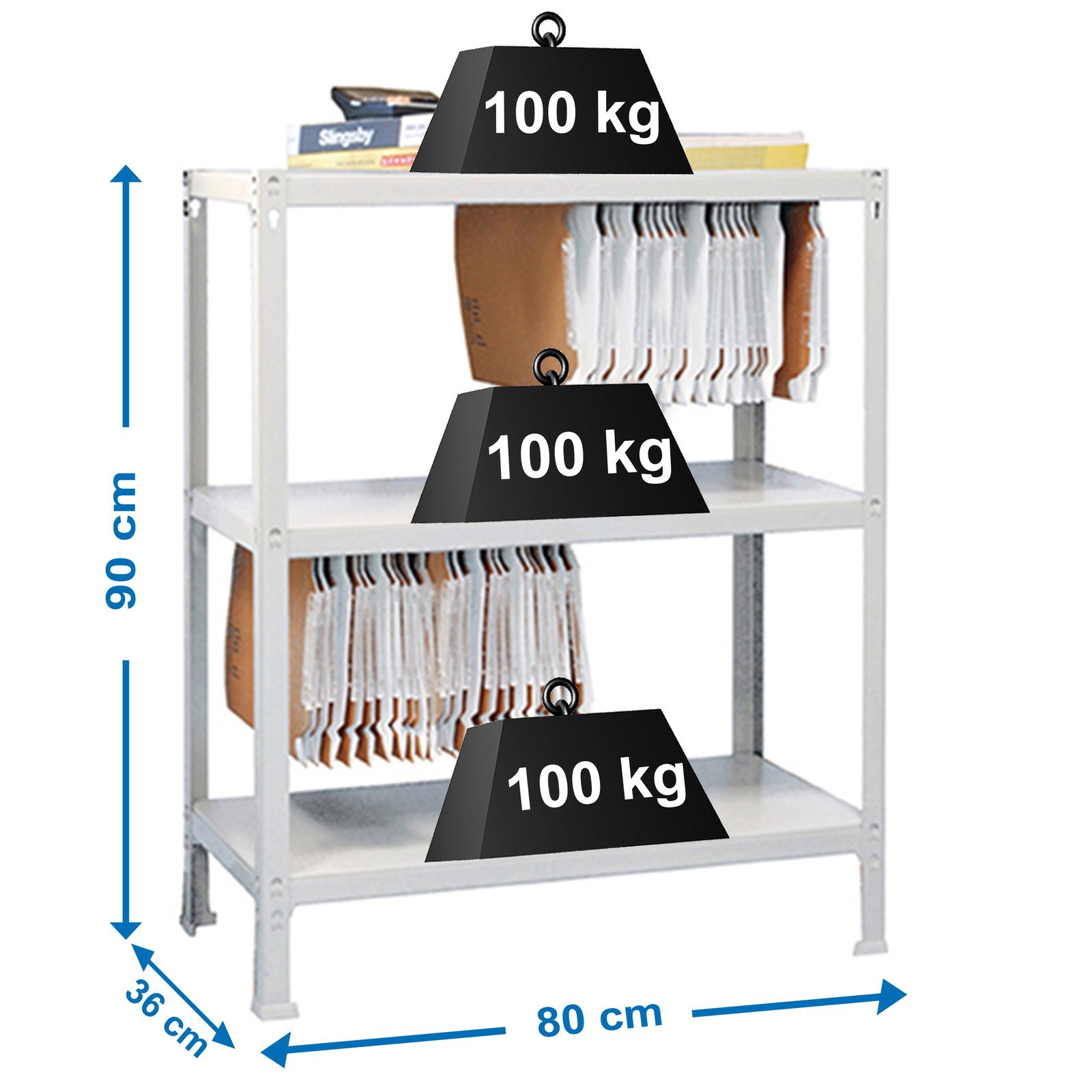 Estanteria metalica sin tornillos con bandejas metalicas. Montaje facil y rapido, en unos minutos la puedes tener montada. Es rigida, no se tambalea. No necesita anclaje a la pared. Tiene 3 estantes. Soporta 100 kg por bandeja metalica. Los complementos estan mas orientados a una oficina en el hogar. Lleva colgadores especiales para poder colocar carpetas colgantes. Producto fabricado en Europa por Simonrack. Medidas en uso del producto, 877x810x370 mm