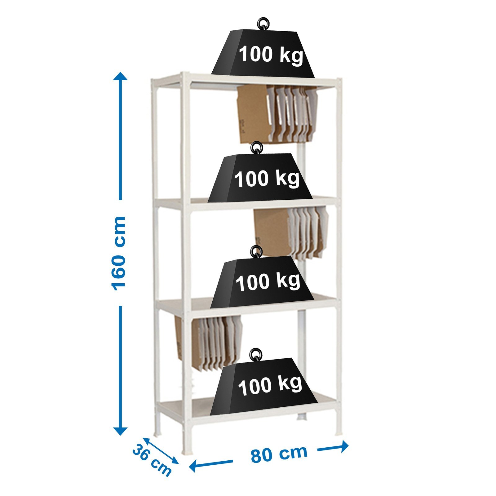 Estanteria metalica sin tornillos con bandejas metalicas. Montaje facil y rapido, en unos minutos la puedes tener montada. Es rigida, no se tambalea. No necesita anclaje a la pared. Tiene 4 estantes. Soporta 100 kg por bandeja metalica. Los complementos estan mas orientados a una oficina en el hogar. Lleva colgadores especiales para poder colocar carpetas colgantes. Producto fabricado en Europa por Simonrack. Medidas en uso del producto, 1585x810x370 mm