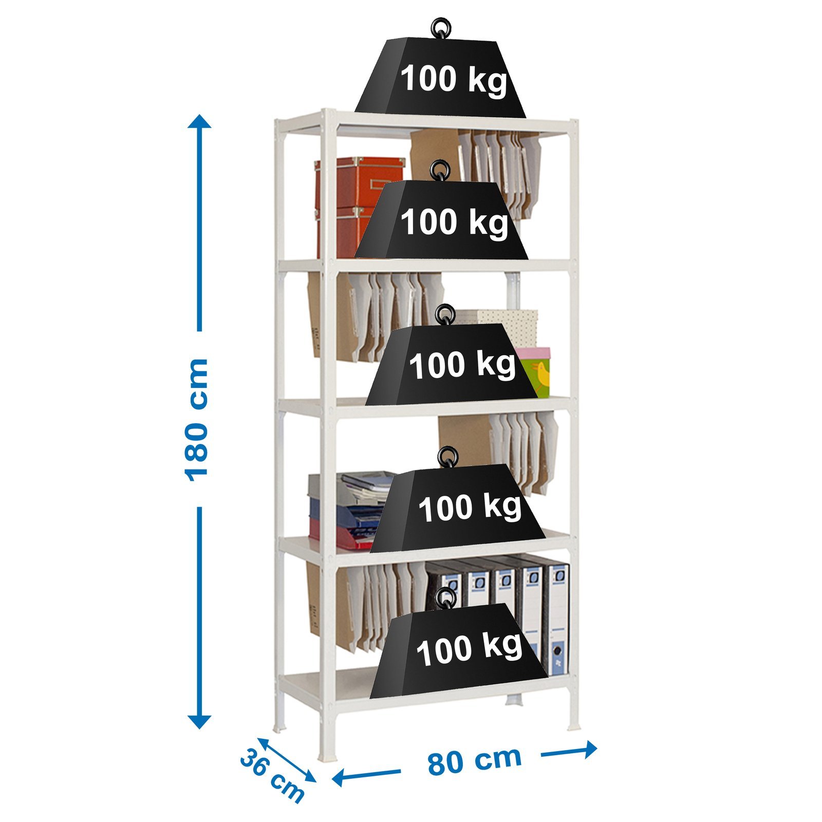 Estanteria metalica sin tornillos con bandejas metalicas. Montaje facil y rapido, en unos minutos la puedes tener montada. Es rigida, no se tambalea. No necesita anclaje a la pared. Tiene 5 estantes. Soporta 100 kg por bandeja metalica. Los complementos estan mas orientados a una oficina en el hogar. Lleva colgadores especiales para poder colocar carpetas colgantes. Producto fabricado en Europa por Simonrack. Medidas en uso del producto, 1810x810x370 mm
