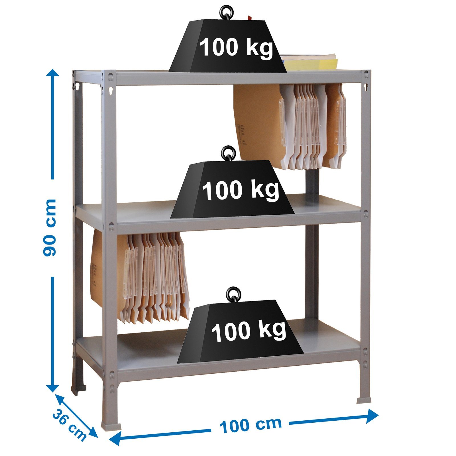 Estanteria metalica sin tornillos con bandejas metalicas. Montaje facil y rapido, en unos minutos la puedes tener montada. Es rigida, no se tambalea. No necesita anclaje a la pared. Tiene 3 estantes. Soporta 100 kg por bandeja metalica. Los complementos estan mas orientados a una oficina en el hogar. Lleva colgadores especiales para poder colocar carpetas colgantes. Producto fabricado en Europa por Simonrack. Medidas en uso del producto, 877x1100x370 mm
