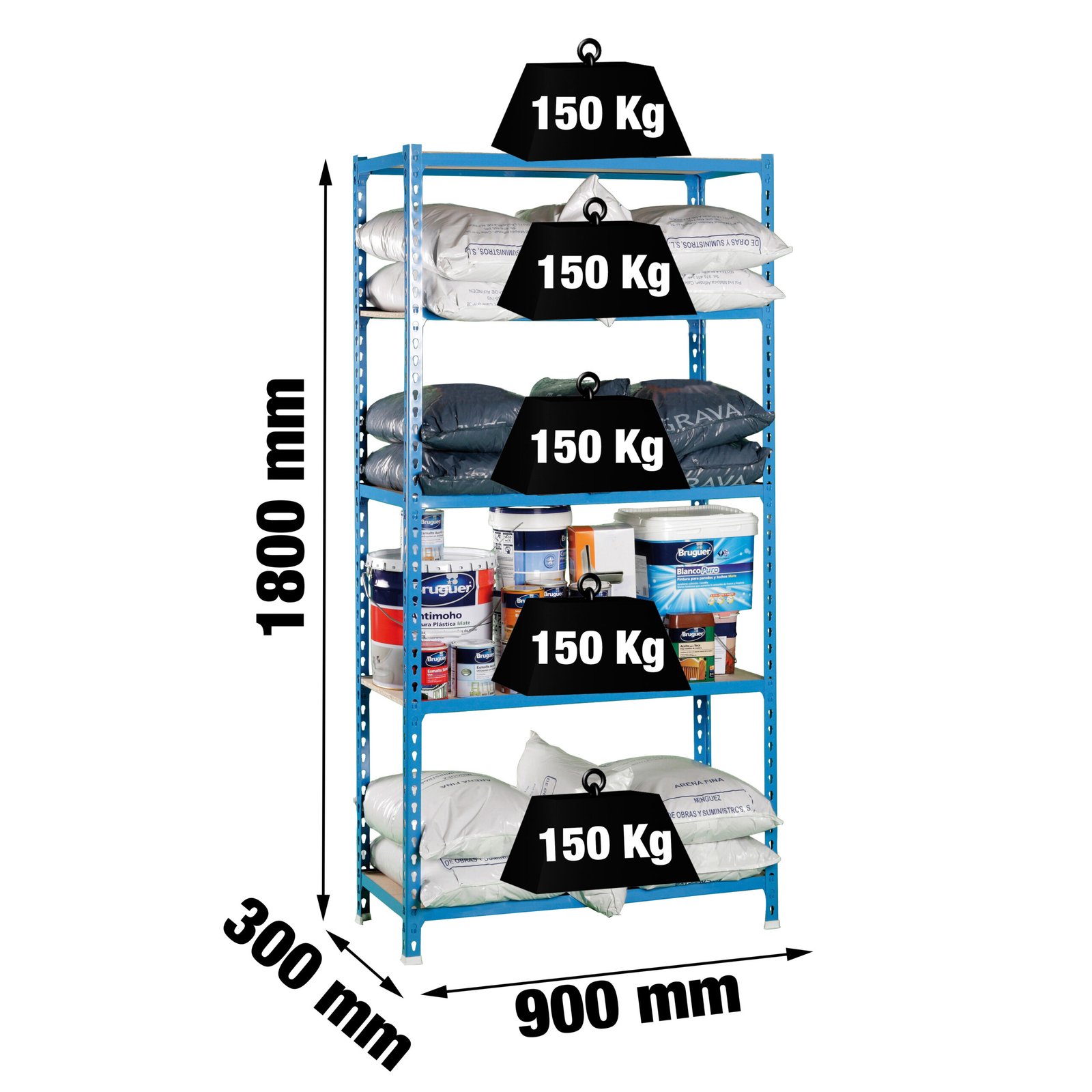 Estanteria metalica sin tornillos de color AZUL/MADERA con capacidad de carga por estante de 150 kg. El numero de estantes es 5 y las medidas (alto x ancho x fondo) son 1800x900x300 mm. Tiene estantes de aglomerado de 12 mm. Producto europeo de calidad europea, podras encontrar las instrucciones de montaje en su interior o en este enlace, https, //www. youtube. com/watch?v=J8R6iEhkKA0&t=3s. Medidas en uso del producto, 1787x910x310 mm