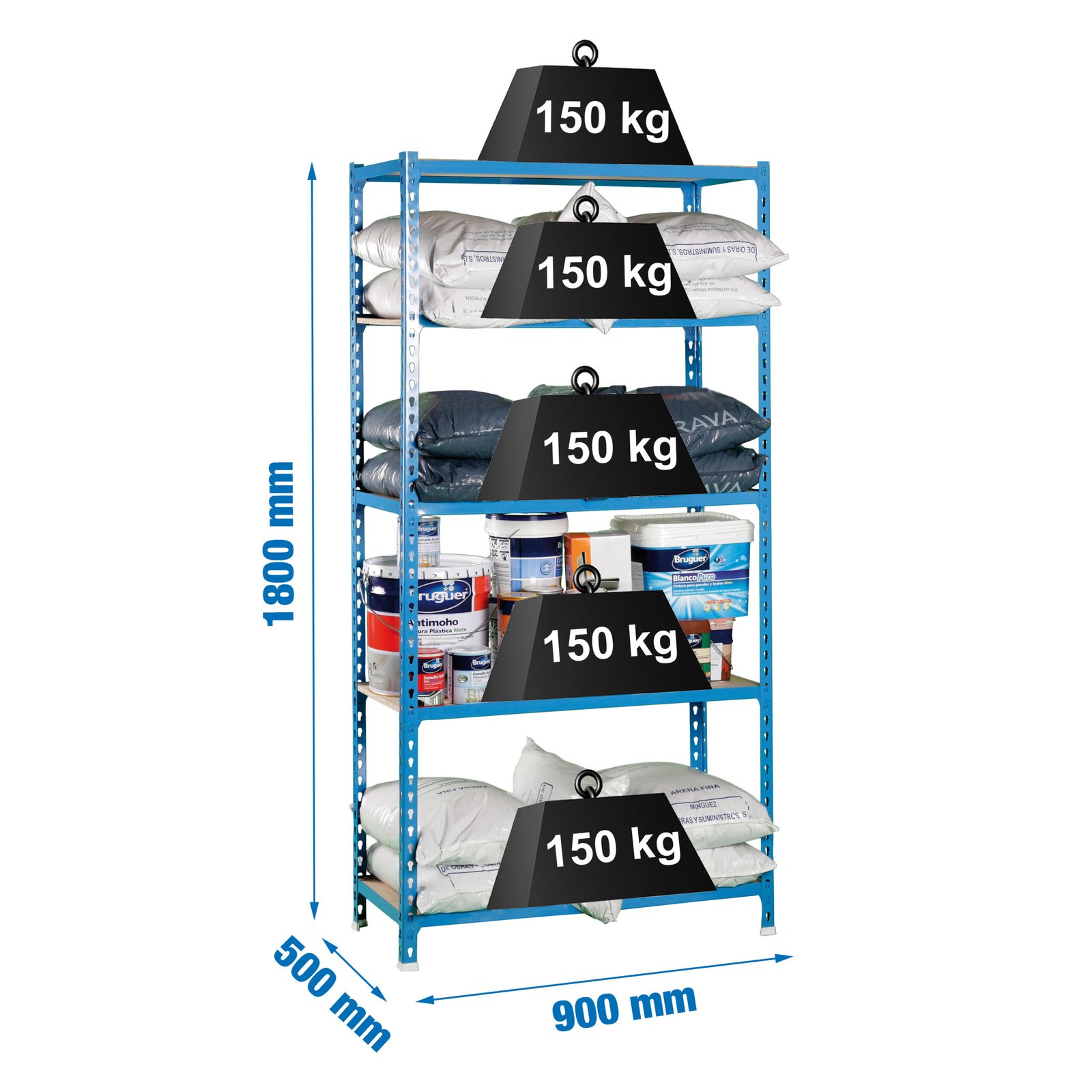 Estanteria metalica sin tornillos de color AZUL/MADERA con capacidad de carga por estante de 150 kg. El numero de estantes es 5 y las medidas (alto x ancho x fondo) son 1800x900x500 mm. Tiene estantes de aglomerado de 12 mm. Producto europeo de calidad europea, podras encontrar las instrucciones de montaje en su interior o en este enlace, https, //www. youtube. com/watch?v=J8R6iEhkKA0&t=3s. Medidas en uso del producto, 1787x877x510 mm