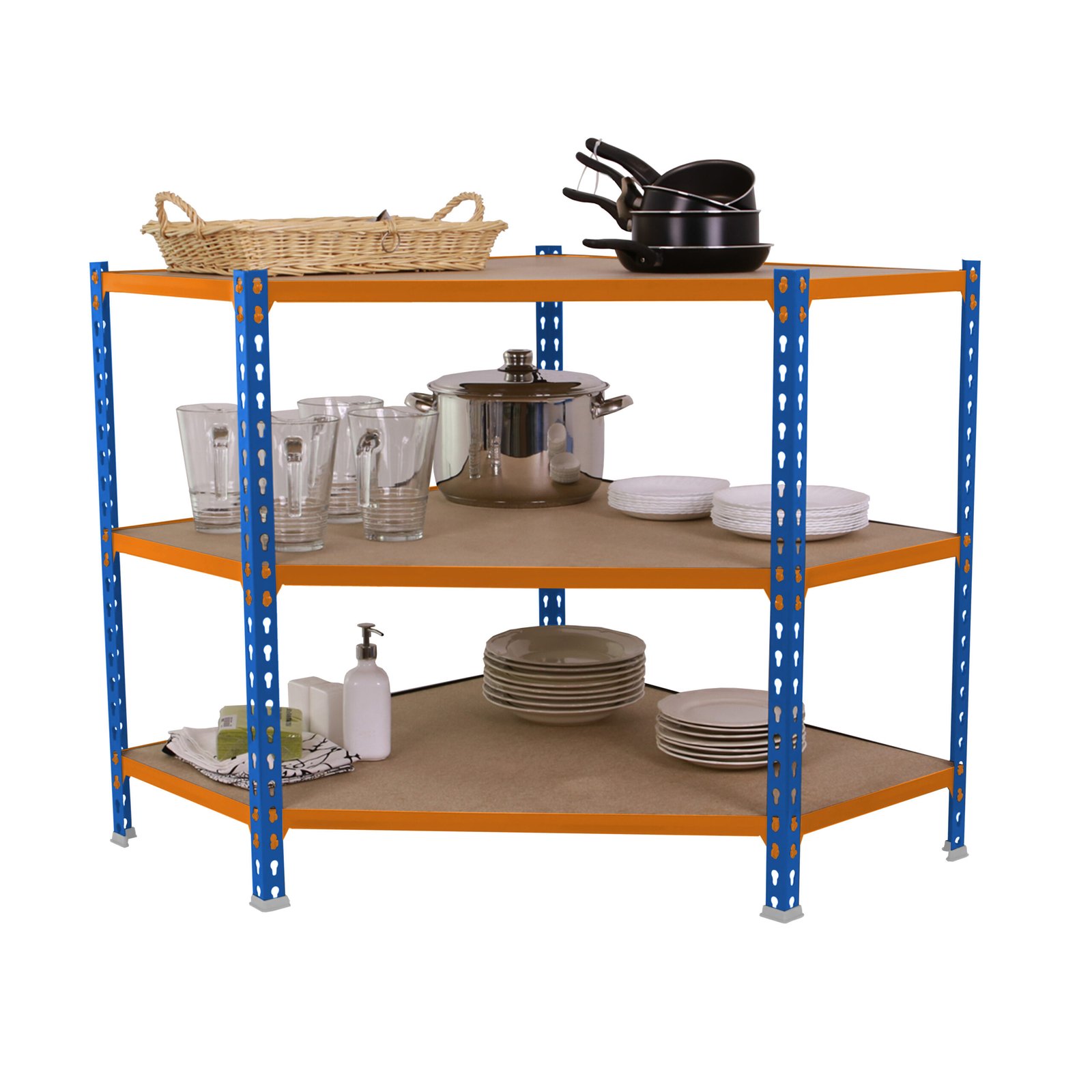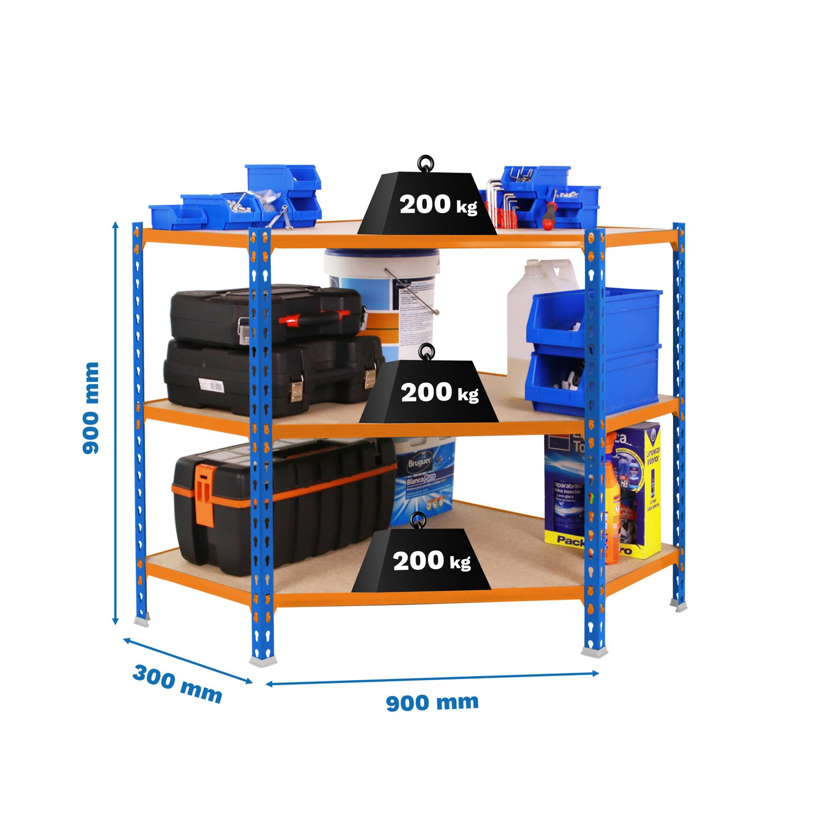 Estanteria metalica esquinera sin tornillos con bandejas de aglomerado, de color AZUL/NARANJA/MADERA. Tiene 3 estantes. Incluye bandejas de aglomerado y 5 pies de plastico blancos. Las dimensiones de esta estanteria son (alto x ancho x fondo), 900x900x300 mm. Tiene 6 largueros cortos de 300 mm cada uno y 3 largueros frontales de 700 mm cada uno. Para mas detalles en cuanto a dimensiones visualizar la siguiente imagen (plano desde arriba), www. simonrack. com/fotos/MCLICKCOR33090ANTMADIM. jpg Tiene una capacidad de carga de 200 kgs por estante, certificada a punto de flexion. No se tambalea y no necesita anclaje a la pared. Montaje facil y rapido sin tornillos, con sistema click. Manipulacion sin riesgos, sin aristas de corte. Ideal para cualquier rincon del hogar, taller o trastero. Producto fabricado en Europa por Simonrack