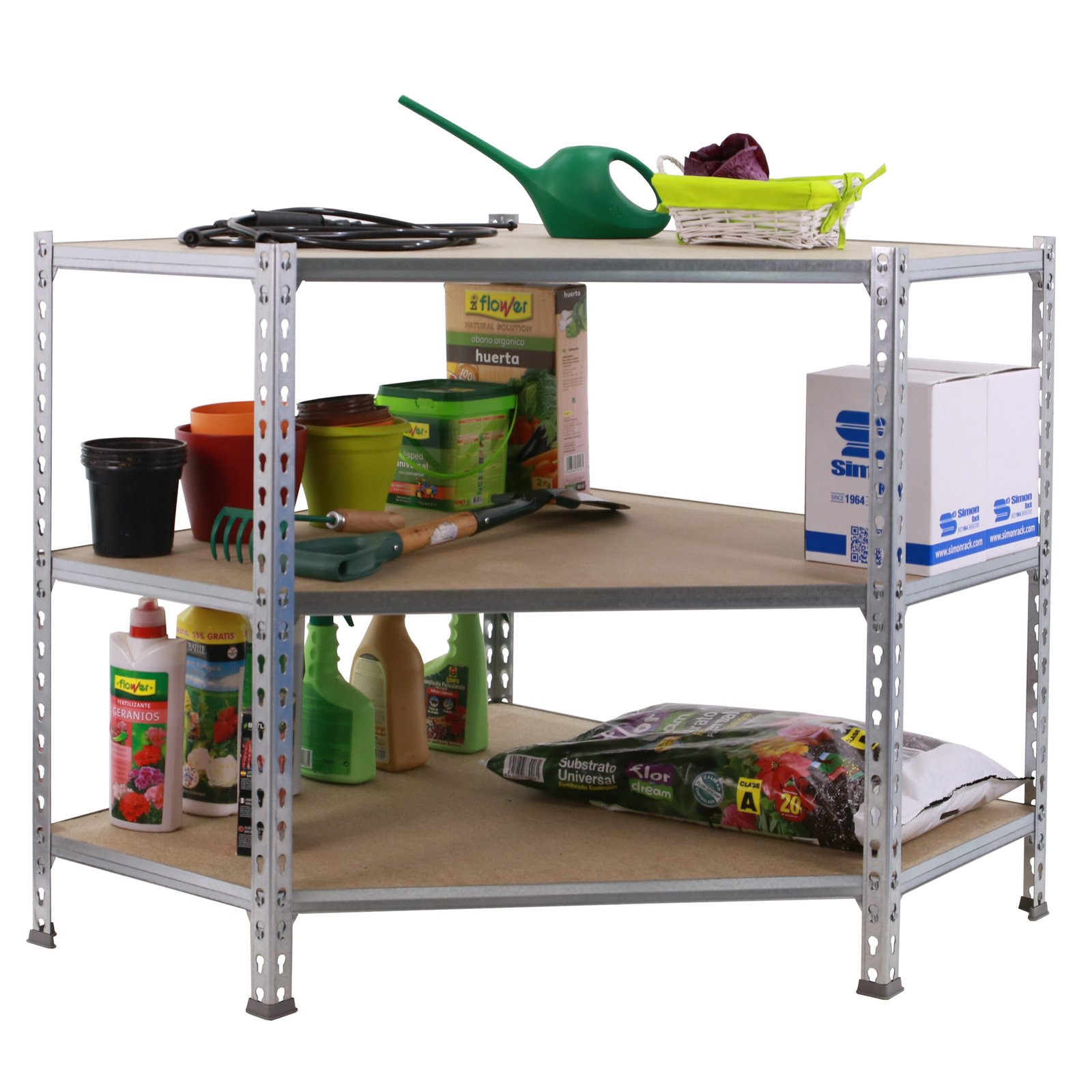 Estanteria metalica esquinera sin tornillos con bandejas de aglomerado, de color GALVA/MADERA. Tiene 3 estantes. Incluye bandejas de aglomerado y 5 pies de plastico grises. Las dimensiones de esta estanteria son (alto x ancho x fondo), 900x900x300 mm. Tiene 6 largueros cortos de 300 mm cada uno y 3 largueros frontales de 700 mm cada uno. Para mas detalles en cuanto a dimensiones visualizar la siguiente imagen (plano desde arriba), www. simonrack. com/fotos/MCLICKCOR33090ANTMADIM. jpg Tiene una capacidad de carga de 200 kgs por estante, certificada a punto de flexion. No se tambalea y no necesita anclaje a la pared. Montaje facil y rapido sin tornillos, con sistema click. Manipulacion sin riesgos, sin aristas de corte. Ideal para cualquier rincon del hogar, taller o trastero. Producto fabricado en Europa por Simonrack