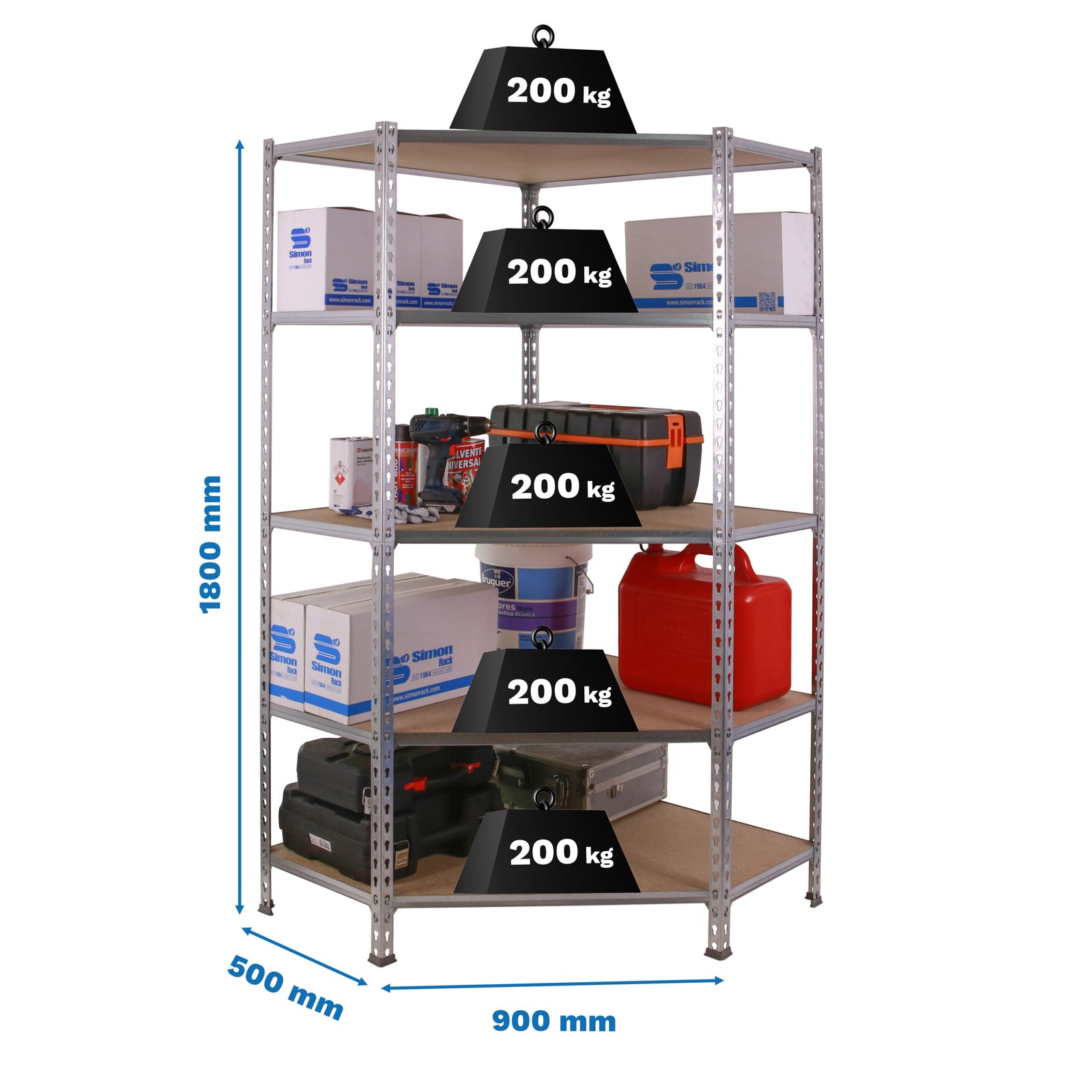 Estanteria metalica esquinera sin tornillos con bandejas de aglomerado, de color GALVA/MADERA. Tiene 5 estantes. Incluye bandejas de aglomerado y 5 pies de plastico grises. Tiene perfil partido. Las dimensiones de esta estanteria son (alto x ancho x fondo), 1800x900x500 mm. Tiene 10 largueros cortos de 500 mm cada uno y 5 largueros frontales de 720 mm cada uno. Para mas detalles en cuanto a dimensiones visualizar la siguiente imagen (plano desde arriba), www. simonrack. com/fotos/MCLICKCOR55090ANTMADIM. jpg Tiene una capacidad de carga de 200 kgs por estante, certificada a punto de flexion. No se tambalea y no necesita anclaje a la pared. Montaje facil y rapido sin tornillos, con sistema click. Manipulacion sin riesgos, sin aristas de corte. Ideal para cualquier rincon del hogar, taller o trastero. Producto fabricado en Europa por Simonrack