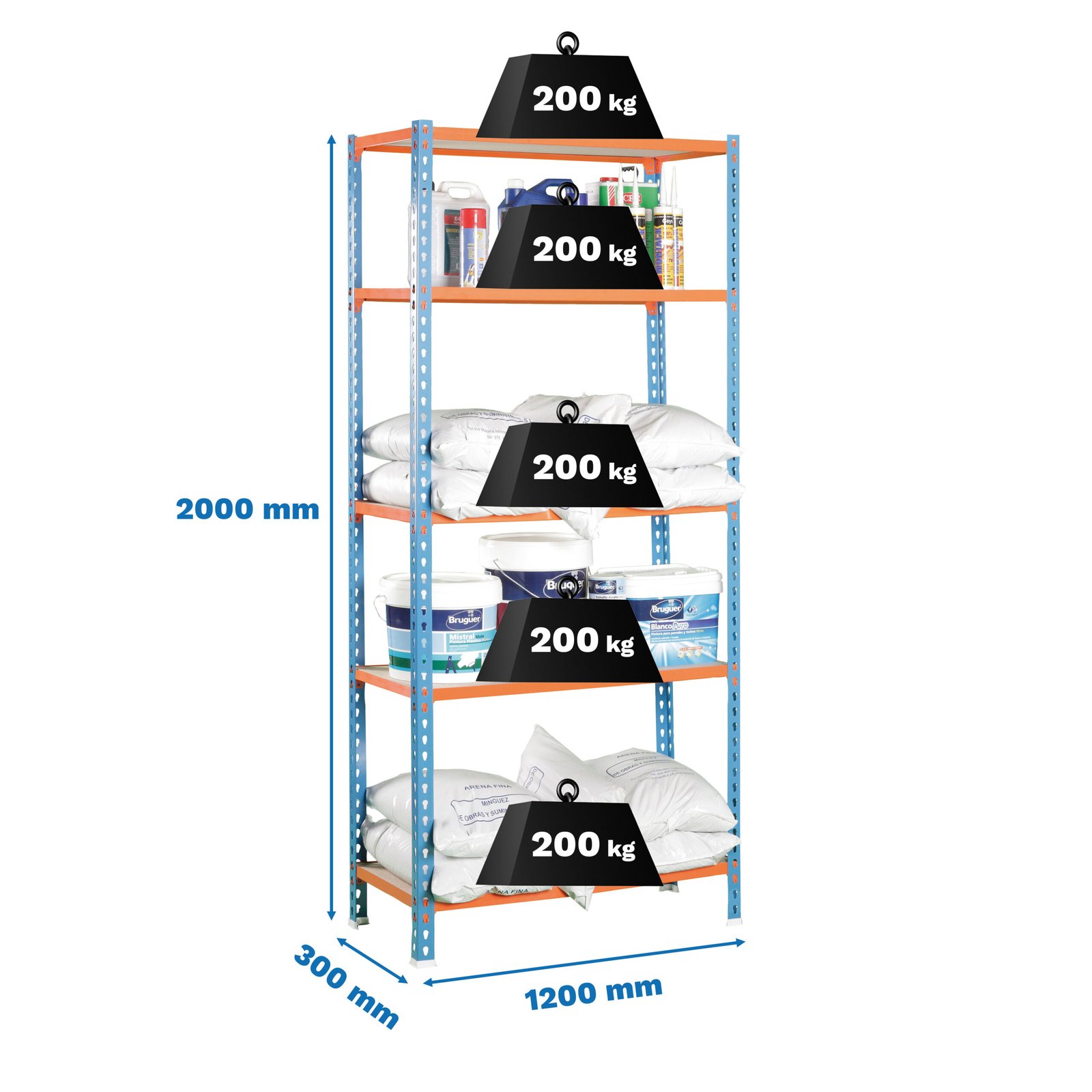 Estanteria metalica sin tornillos, de color azul/naranja/madera con 5 estantes de madera. Tiene una capacidad de carga por estante de 200 kg y una capacidad total de 1000 kgs. Con unas medidas en mm de 2000x1200x300. Fabricada en Europa por Simonrack y se monta rapido siguiendo las instrucciones