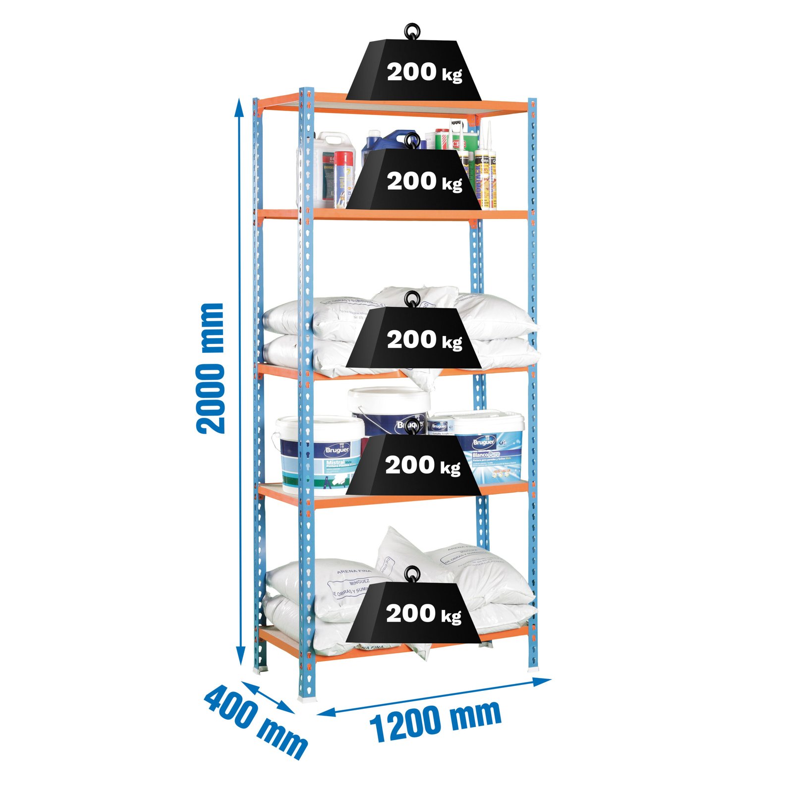 Estanteria metalica sin tornillos, de color azul/naranja/madera con 5 estantes de madera. Tiene una capacidad de carga por estante de 200 kg y una capacidad total de 1000 kgs. Con unas medidas en mm de 2000x1200x400. Fabricada en Europa por Simonrack y se monta rapido siguiendo las instrucciones