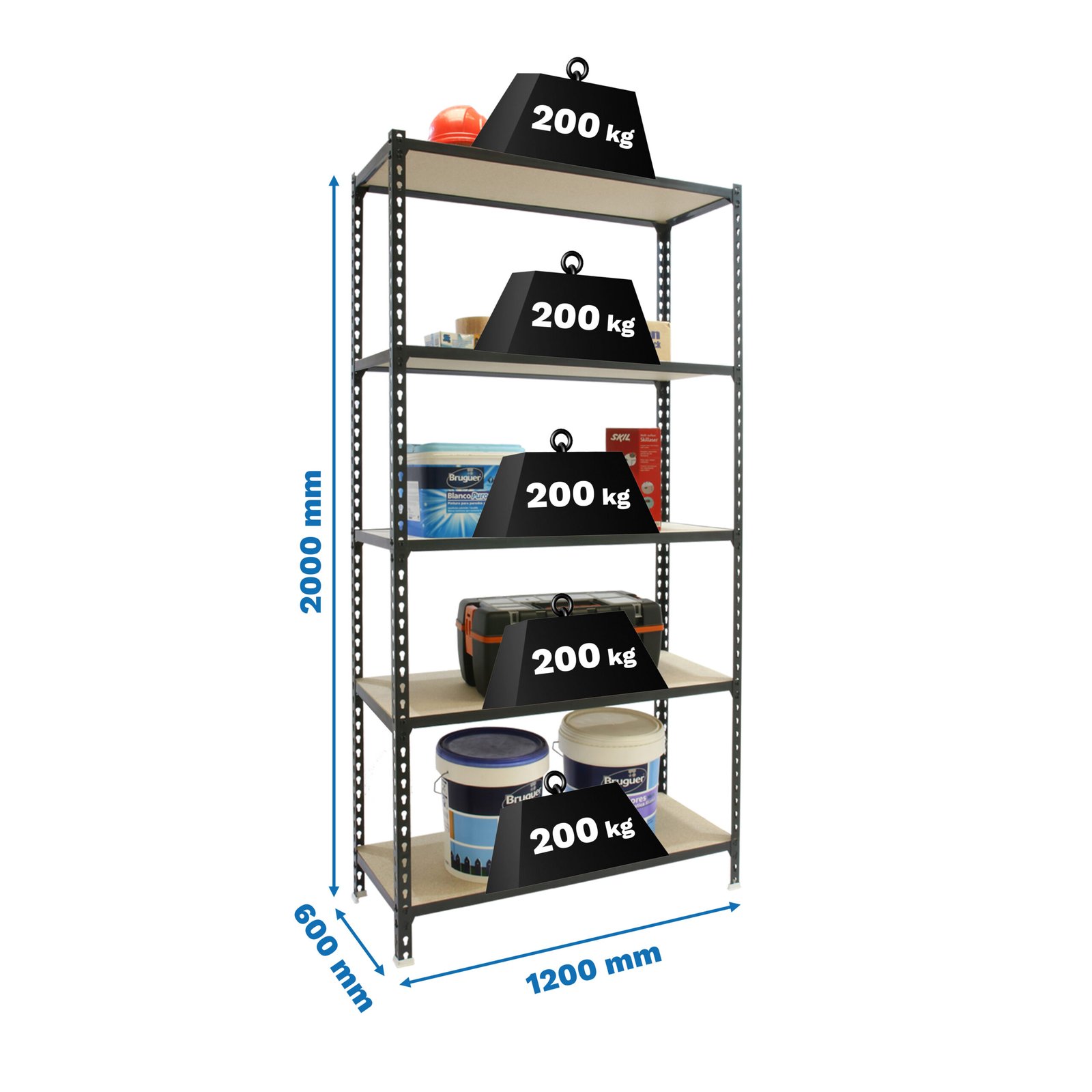 Estanteria metalica sin tornillos de color antracita/madera con capacidad de carga por estante de 200 kg, carga certificada a punto de flexion, no de rotura. El numero de estantes es 5 y las medidas (alto x ancho x fondo) son 2000x1200x600 mm. Tiene estantes de aglomerado de 12 mm. Producto fabricado en Europa por Simonrack por Simonrack. Podras encontrar las instrucciones de montaje en su interior o en este enlace, https, //www. youtube. com/watch?v=J8R6iEhkKA0&t=3s. Medidas en uso del producto, 1975x1210x610 mm. Contiene todos sus fondos. No contiene aristas de corte, manipulacion sin riesgo. No se tambalea. Estructura con recubrimiento epoxi poliester antirayaduras e ignifugo