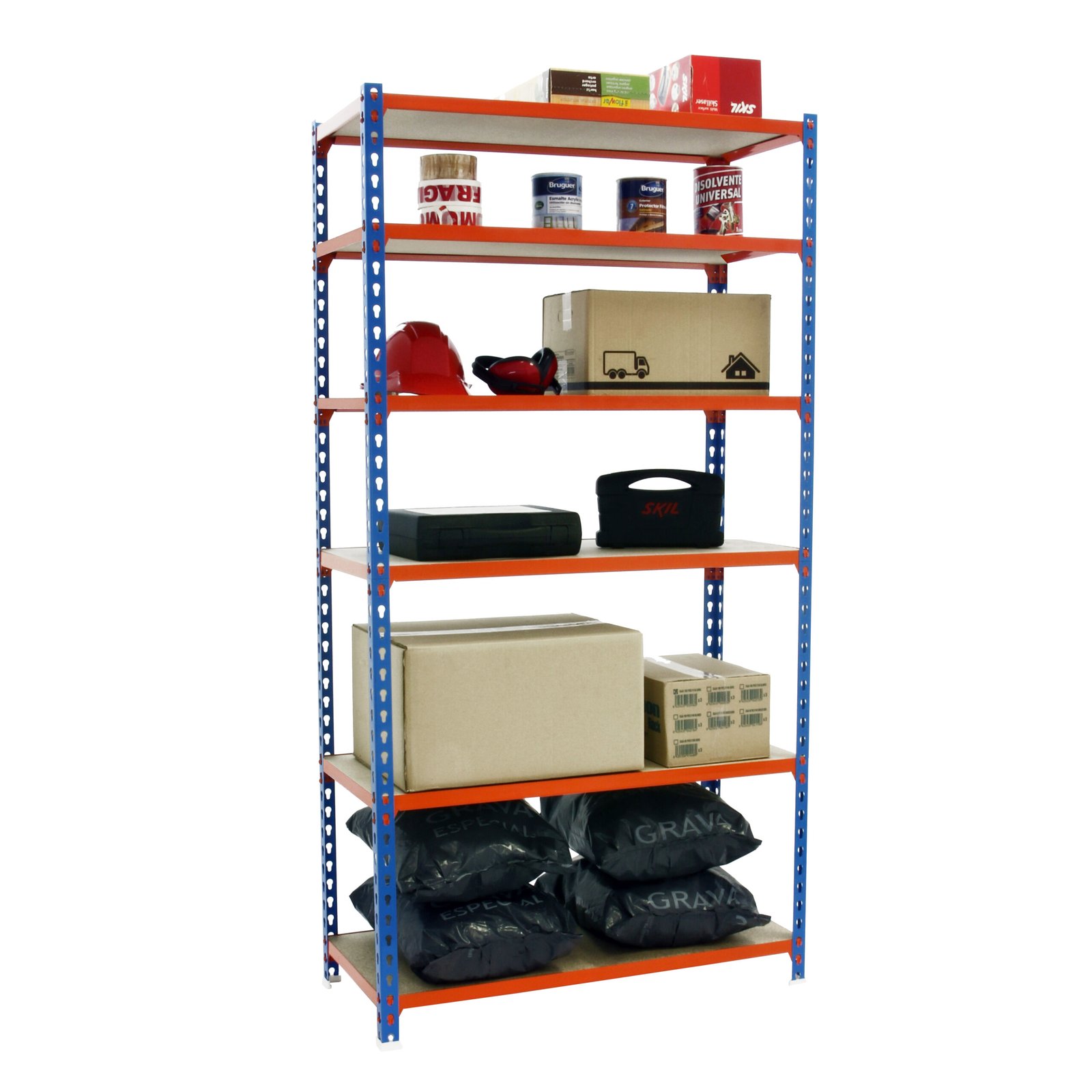 Estanteria metalica sin tornillos, de color azul/naranja/madera con 6 estantes de madera. Tiene una capacidad de carga por estante de 200 kg y una capacidad total de 1200 kgs. Con unas medidas en mm de 2500x1200x400. Fabricada en Europa por Simonrack y se monta rapido siguiendo las instrucciones