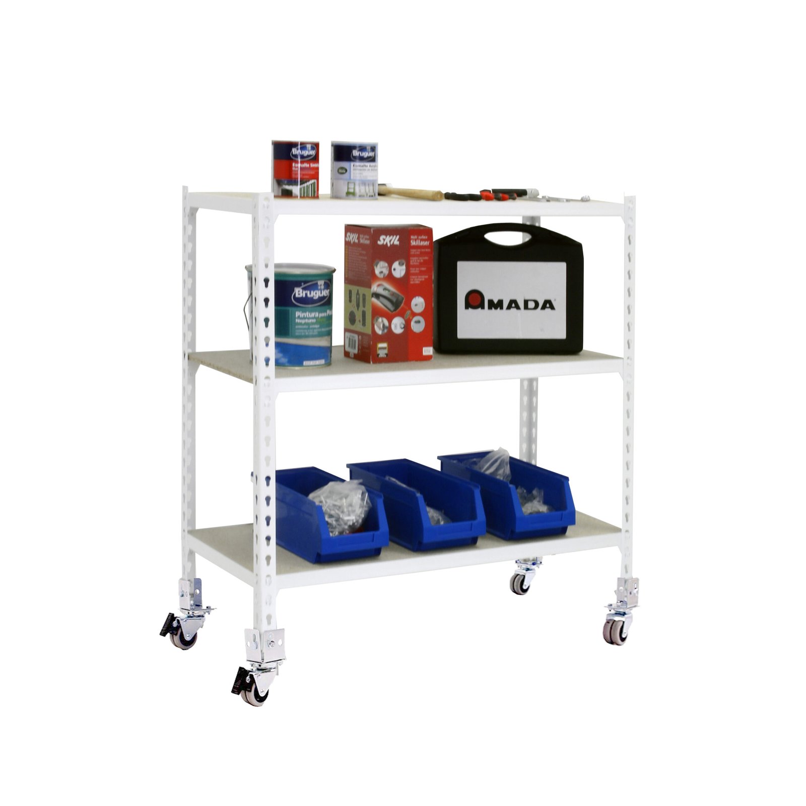 Estanteria metalica sin tornillos de color BLANCO/MADERA con capacidad de carga por estante de 90 kg. El numero de estantes es 3 y las medidas (alto x ancho x fondo) son 975x800x500 mm. Tiene estantes de aglomerado de 12 mm. Producto europeo de calidad europea, podras encontrar las instrucciones de montaje en su interior o en este enlace, https, //www. youtube. com/watch?v=J8R6iEhkKA0&t=3s. Medidas en uso del producto, 952x810x510 mm