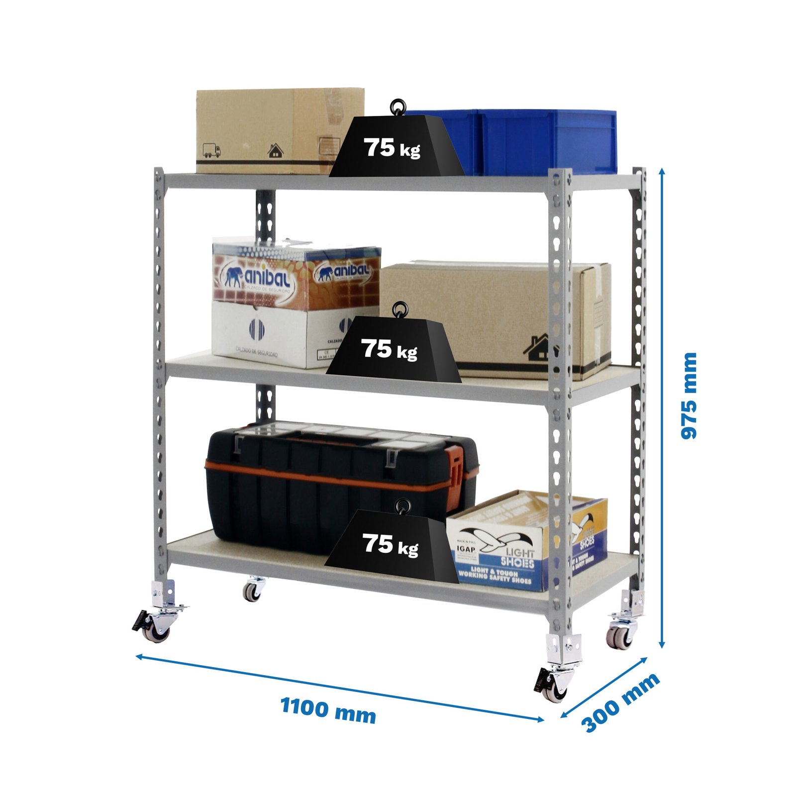 Estanteria metalica sin tornillos con 3 estantes de bandeja de aglomerado. Estanteria que se monta de forma facil y comoda gracias a su sistema de click, sin tornillos simplemente con la ayuda de un martillo podras tener esta estanteria montada en unos minutos. Tienes a tu disposicion un video detallado de montaje en Youtube. Al llevar ruedas, la capacidad de carga de la estanteria en total es de 120 kg uniformemente repartida. El primer larguero debe estar en el agujero inmediatamente superior a la rueda. La estanteria tiene un fondo de 30 cm. Contiene un recubrimiento plastico y acaaseo en epoxypoliester. Ademas es muy facil de limpiar. Manipulacion del producto sin aristas de corte, sin riesgos de manipulacion. Es un producto fabricado en Europa por Simonrack. Medidas en uso del producto, 952x1110x310 mm
