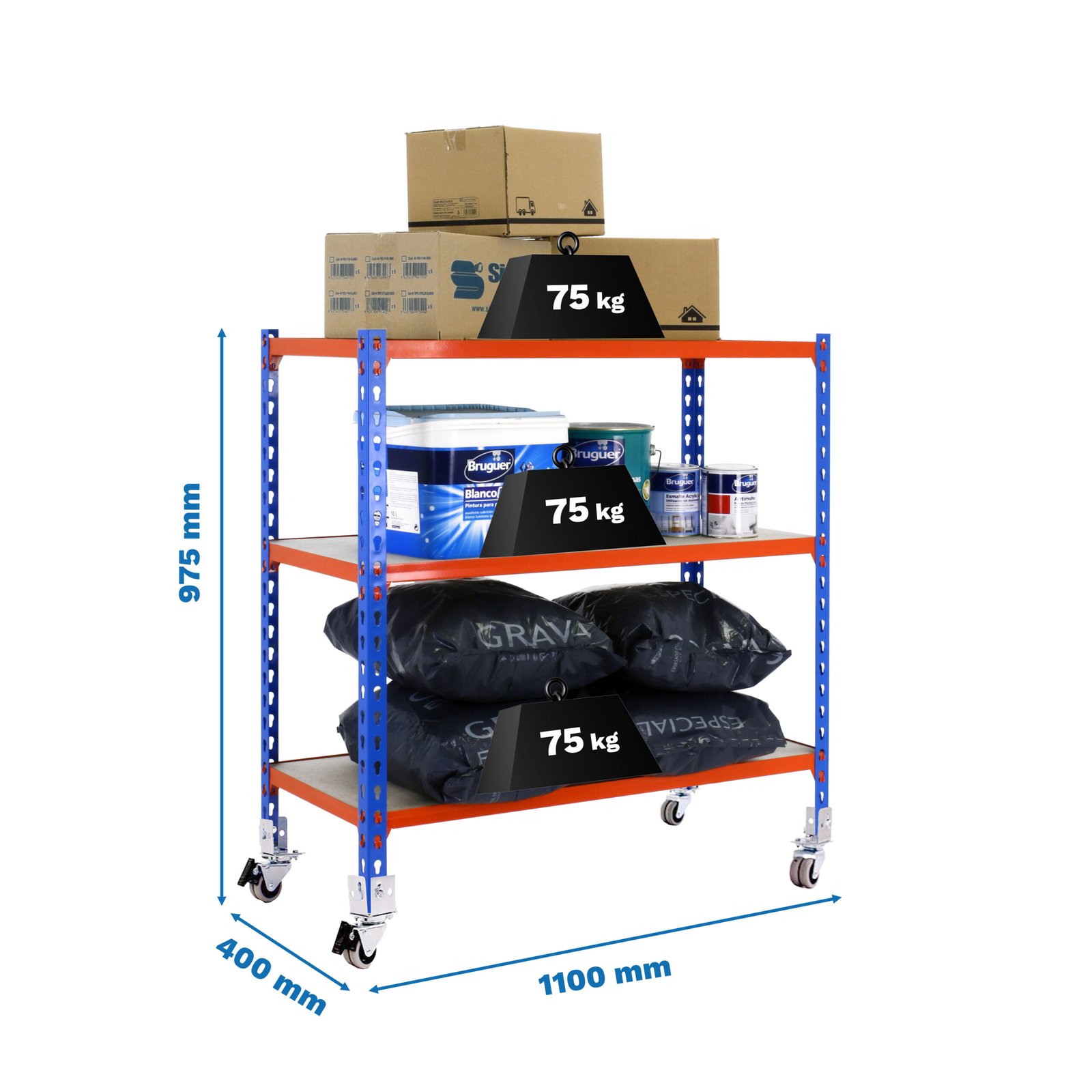 Estanteria metalica sin tornillos con 3 estantes de bandeja de aglomerado. Estanteria que se monta de forma facil y comoda gracias a su sistema de click, sin tornillos simplemente con la ayuda de un martillo podras tener esta estanteria montada en unos minutos. Tienes a tu disposicion un video detallado de montaje en Youtube. Al llevar ruedas, la capacidad de carga de la estanteria en total es de 120 kg uniformemente repartida. El primer larguero debe estar en el agujero inmediatamente superior a la rueda. La estanteria tiene un fondo de 40 cm. Contiene un recubrimiento plastico y acaaseo en epoxypoliester. Ademas es muy facil de limpiar. Manipulacion del producto sin aristas de corte, sin riesgos de manipulacion. Es un producto fabricado en Europa por Simonrack. Medidas en uso del producto, 952x1110x410 mm