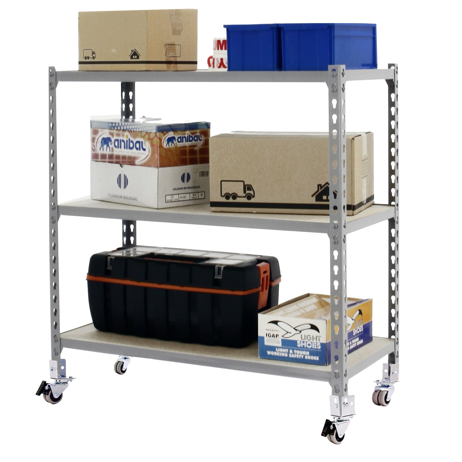 Estanteria metalica sin tornillos con 3 estantes de bandeja de aglomerado. Estanteria que se monta de forma facil y comoda gracias a su sistema de click, sin tornillos simplemente con la ayuda de un martillo podras tener esta estanteria montada en unos minutos. Tienes a tu disposicion un video detallado de montaje en Youtube. Al llevar ruedas, la capacidad de carga de la estanteria en total es de 120 kg uniformemente repartida. El primer larguero debe estar en el agujero inmediatamente superior a la rueda. La estanteria tiene un fondo de 40 cm. Contiene un recubrimiento plastico y acaaseo en epoxypoliester. Ademas es muy facil de limpiar. Manipulacion del producto sin aristas de corte, sin riesgos de manipulacion. Es un producto fabricado en Europa por Simonrack. Medidas en uso del producto, 952x1110x410 mm