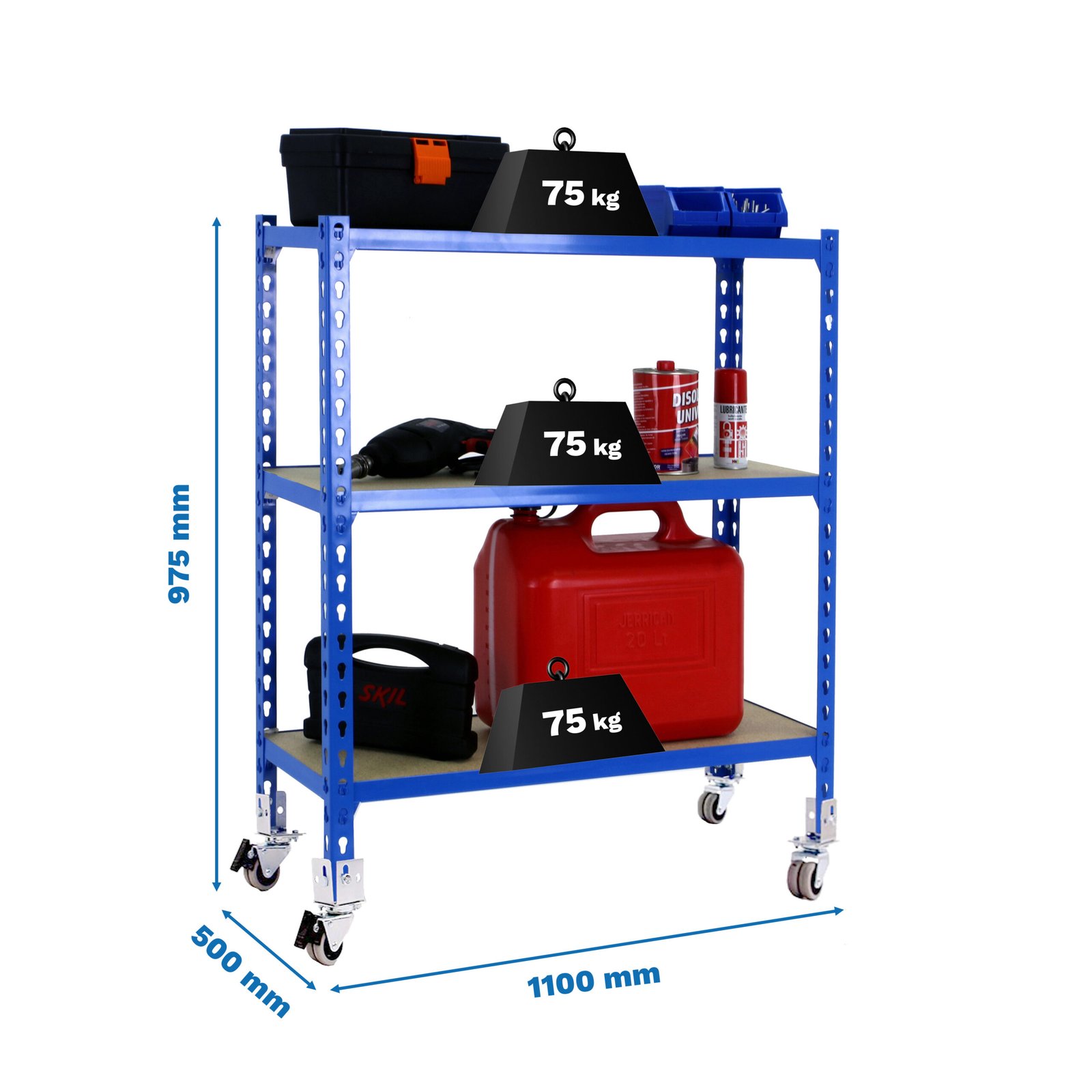Estanteria metalica sin tornillos con 3 estantes de bandeja de aglomerado. Estanteria que se monta de forma facil y comoda gracias a su sistema de click, sin tornillos simplemente con la ayuda de un martillo podras tener esta estanteria montada en unos minutos. Tienes a tu disposicion un video detallado de montaje en Youtube. Al llevar ruedas, la capacidad de carga de la estanteria en total es de 120 kg uniformemente repartida. El primer larguero debe estar en el agujero inmediatamente superior a la rueda. La estanteria tiene un fondo de 50 cm. Contiene un recubrimiento plastico y acaaseo en epoxypoliester. Ademas es muy facil de limpiar. Manipulacion del producto sin aristas de corte, sin riesgos de manipulacion. Es un producto fabricado en Europa por Simonrack. Medidas en uso del producto, 952x1110x510 mm
