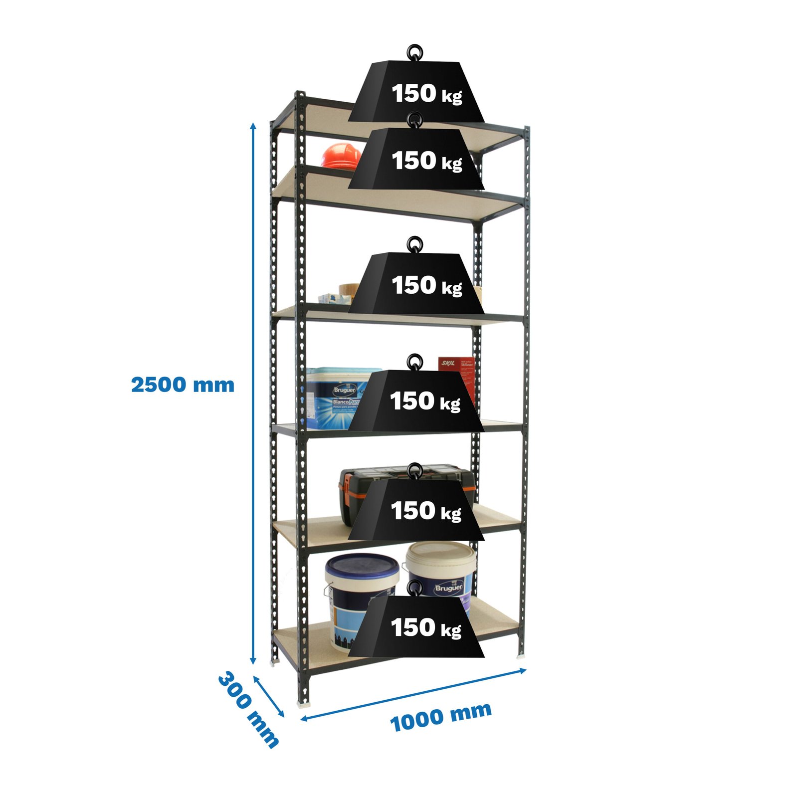 Estanteria metalica sin tornillos con aglomerado, de color ANTRACITA/MADERA. Tiene 6 estantes. Las dimensiones de esta estanteria son, 2500x1000x300 mm. Y tiene una capacidad de carga de 150 kgs, certificamos a punto de flexion, no de rotura. No se tambalea y no tiene aristas de corte. fabricado en Europa por Simonrack y se monta rapido siguiendo las instrucciones
