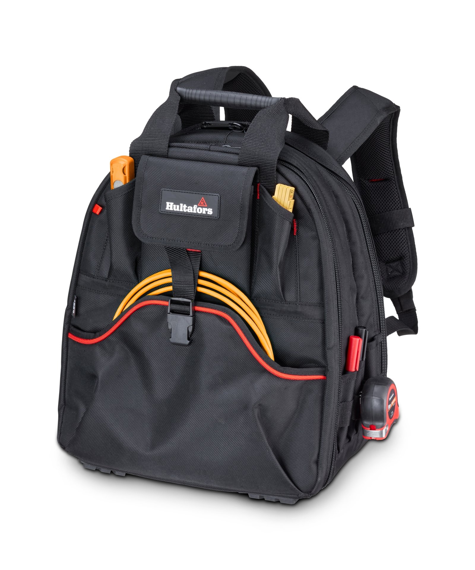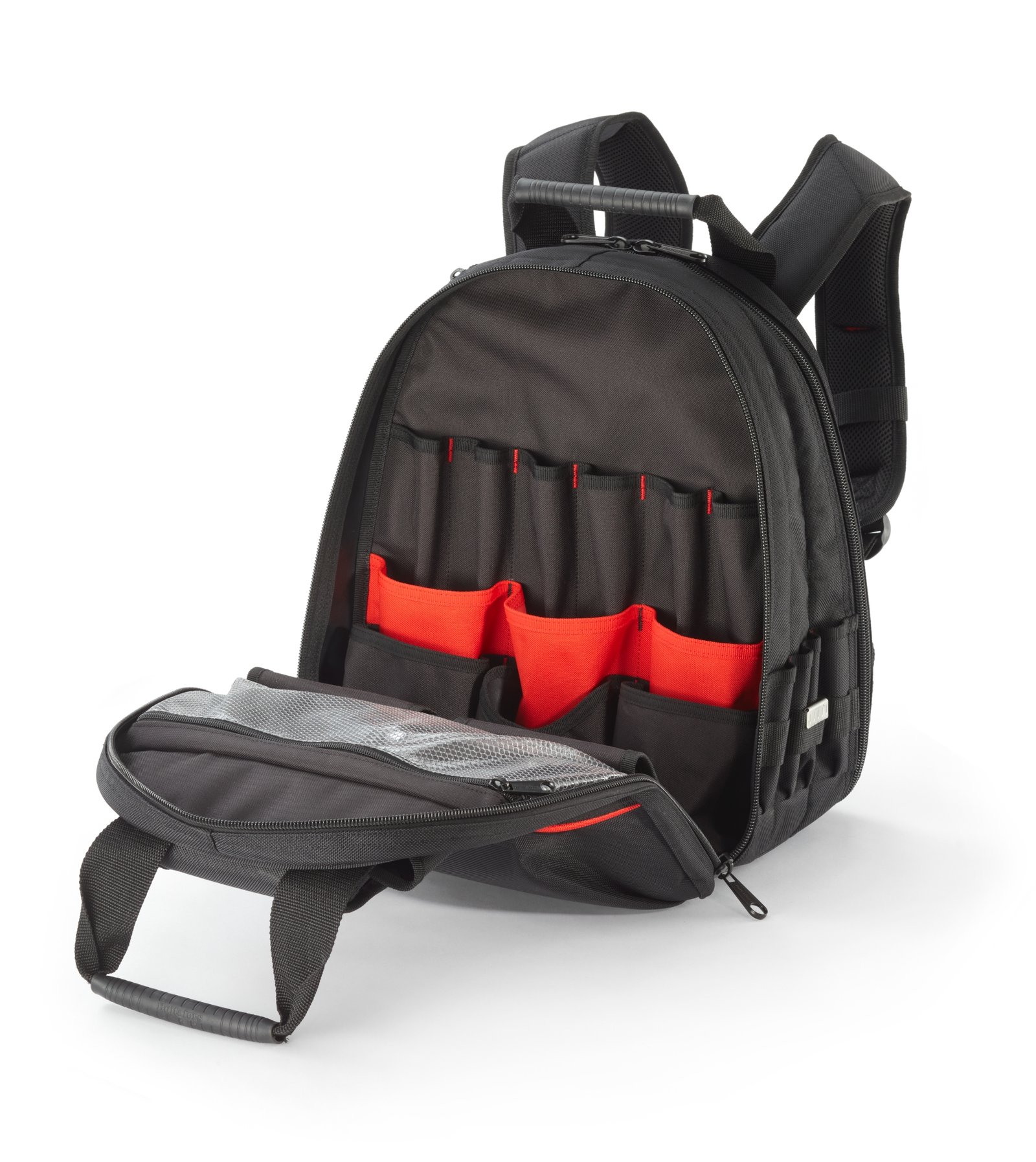 La bolsa tiene bolsillos de tamaño mediano con tapas y cremalleras para guardar de forma segura equipos sensibles, bolsillos transparentes que facilitan encontrar lo que busca y correas para asegurar herramientas eléctricas y cargadores. Los bolsillos con tela alternada de rojo y negro hacen que sea más fácil distinguir diferentes herramientas y bolsillos.