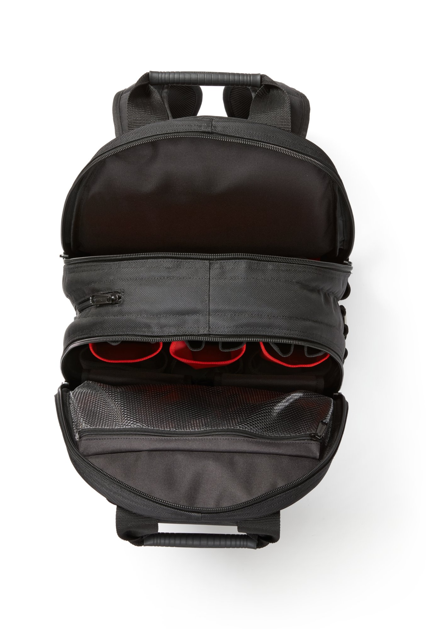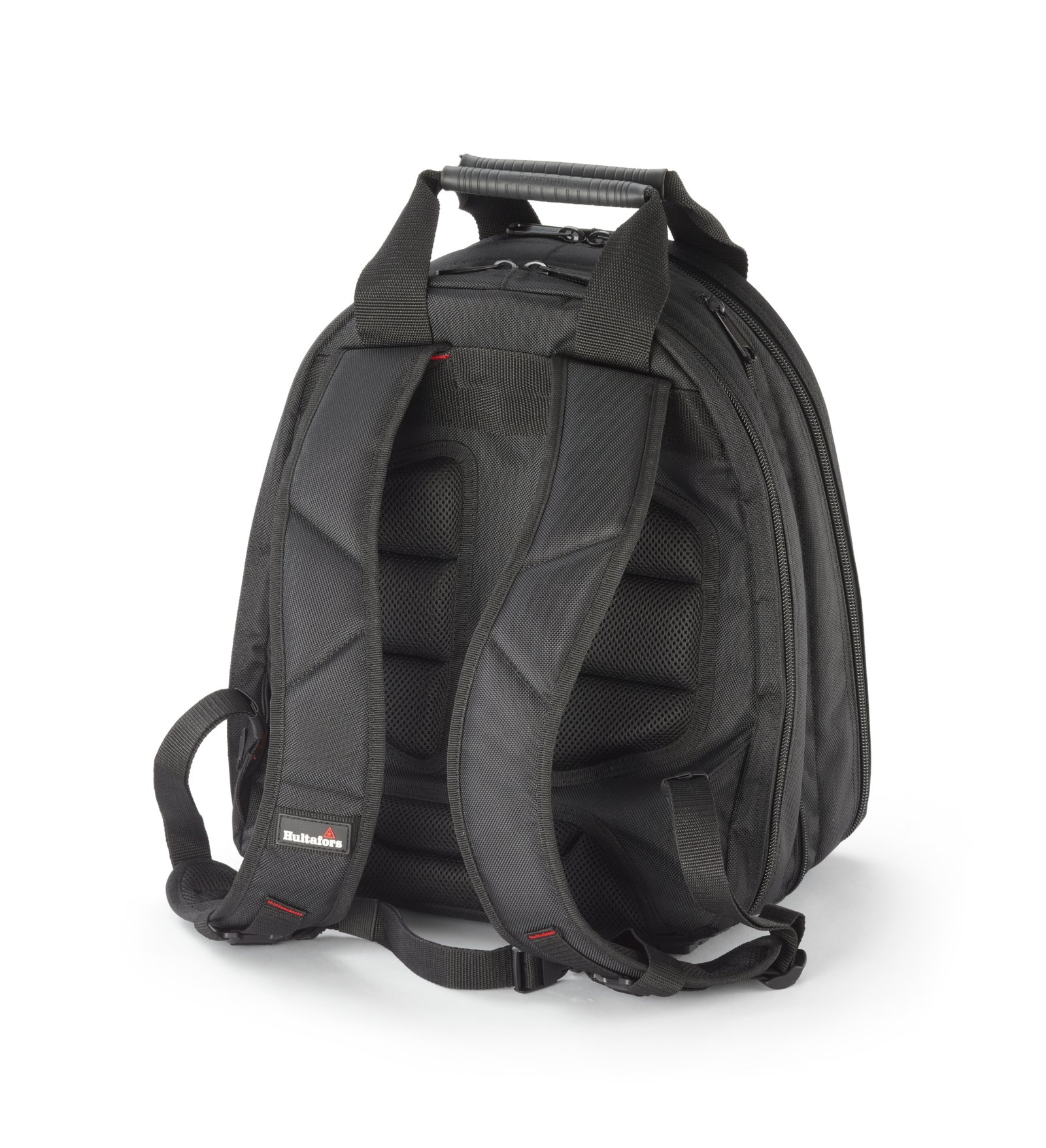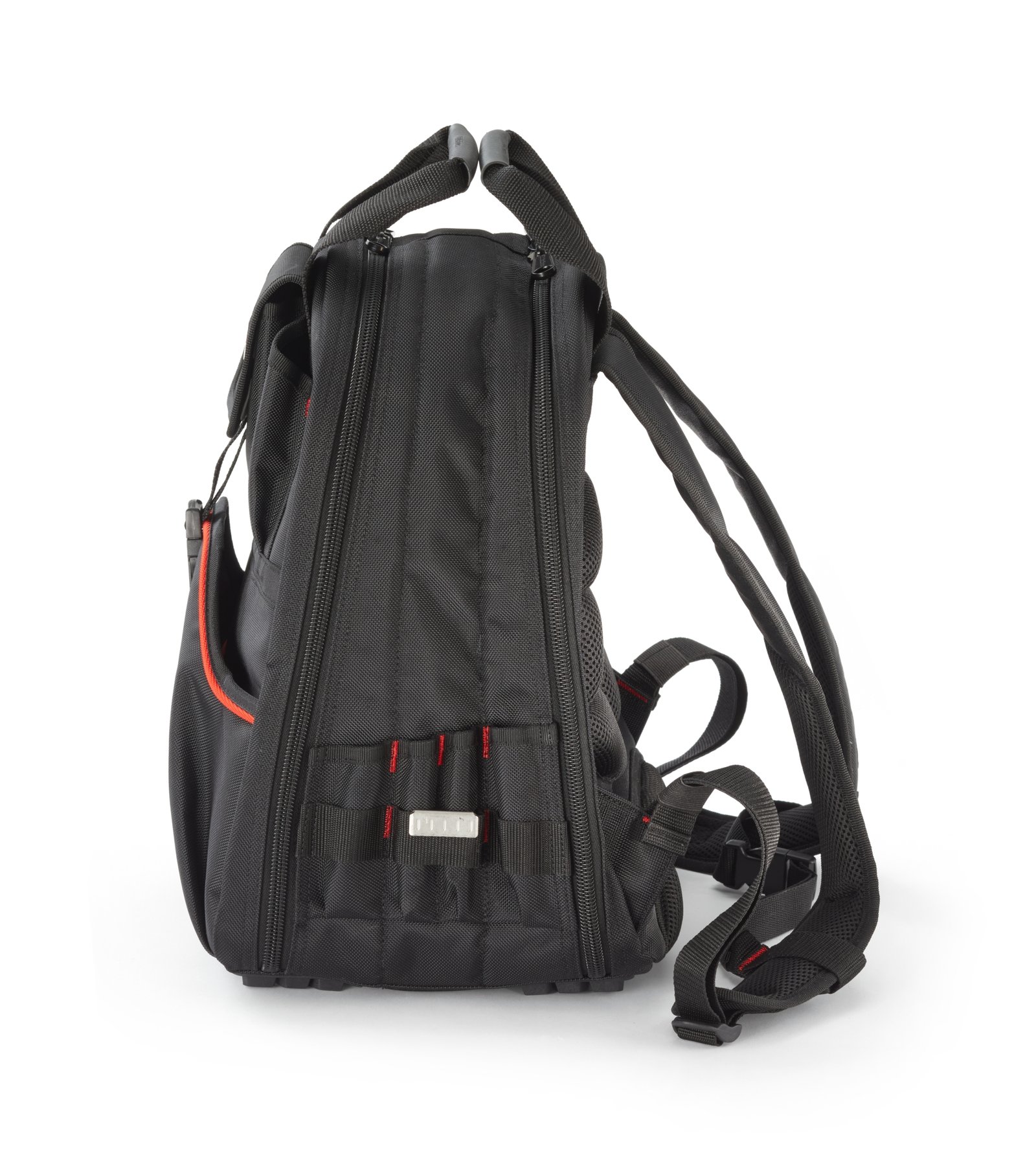 Una mochila para herramientas ergonómica y multiusos con dos compartimentos grandes con cremallera. Las cremalleras de ambos compartimentos se abren completamente, lo que le permite plegar completamente el lado exterior, brindándole la máxima visión general y acceso.
