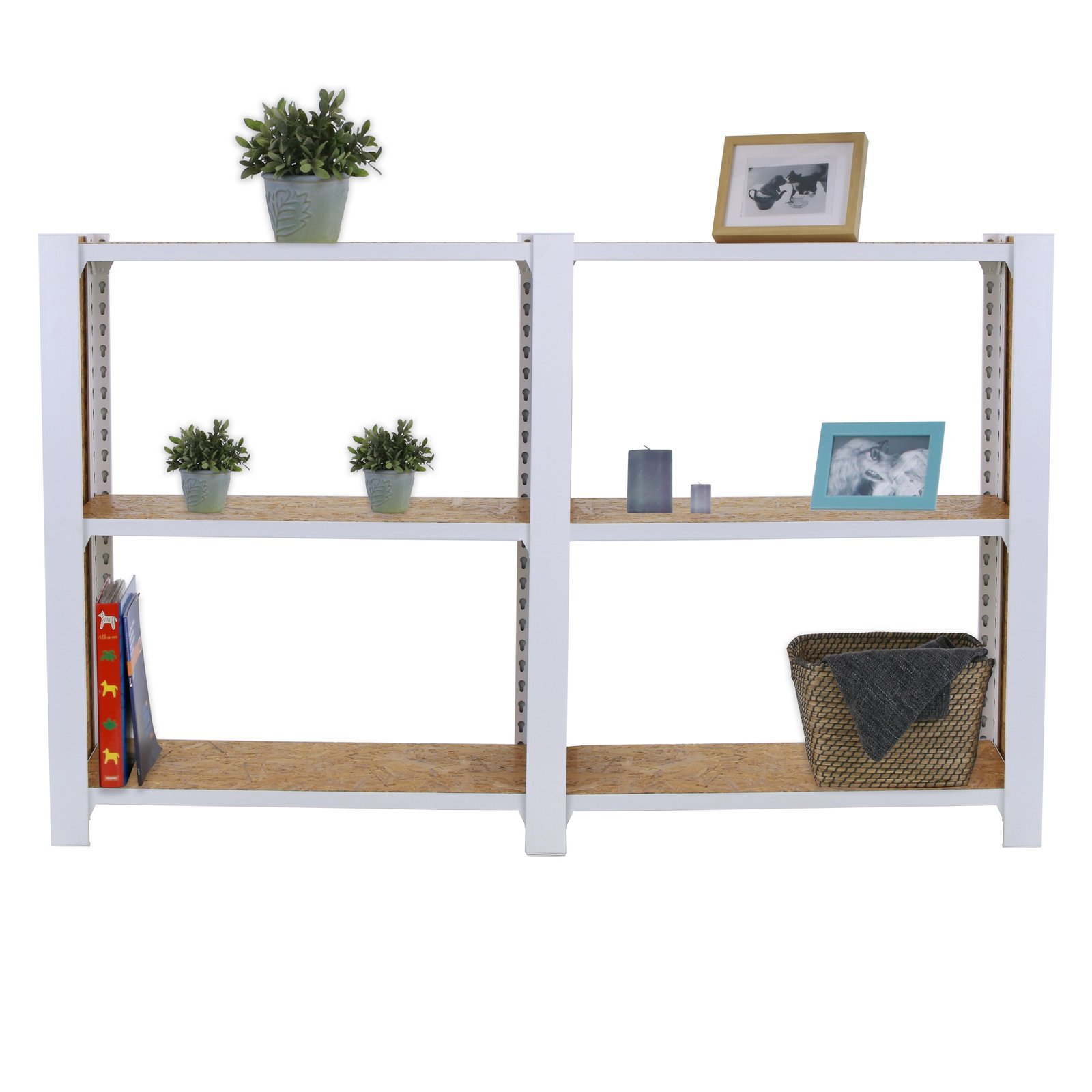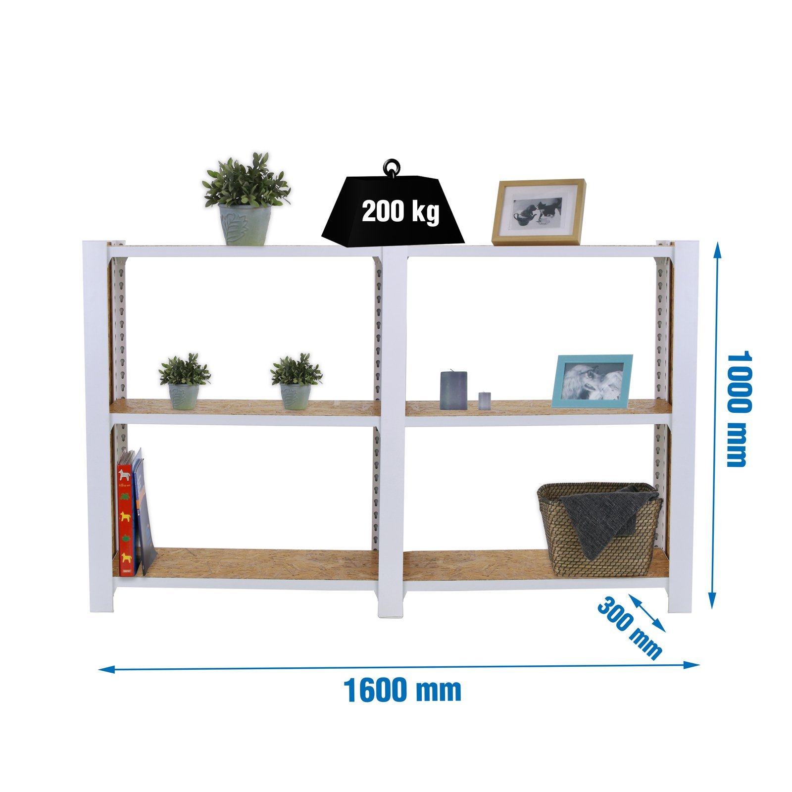 Estanteria metalica sin tornillos de color BLANCO/OSB con capacidad de carga por estante de 200 kg, certificacion a punto de flexion. Incluye tapas laterales de 1000 mm de alto. Son 2 modulos con bandejas de OSB (tableros de virutas orientadas), tableros de alto rendimiento de grosor de 15 mm. Muy versatil enfocado a la decoracion actual, donde su llamativo aspecto juega a su favor ya que por su apariencia industrial empasta completamente en ambientes modernos o vintage. El numero de estantes de cada modulo es 3 (3×2 modulos= 6 estantes) y las medidas del producto (alto x ancho x fondo) son 1000x1600x300 mm. Tiene perfil doble y en forma de T. Perfiles con recubrimiento epoxypoliester. No tiene aristas de corte, manipulacion sin riesgo. No se tambalea y no necesita anclaje a la pared. Producto europeo, calidad europea, podras encontrar las instrucciones de montaje en su interior