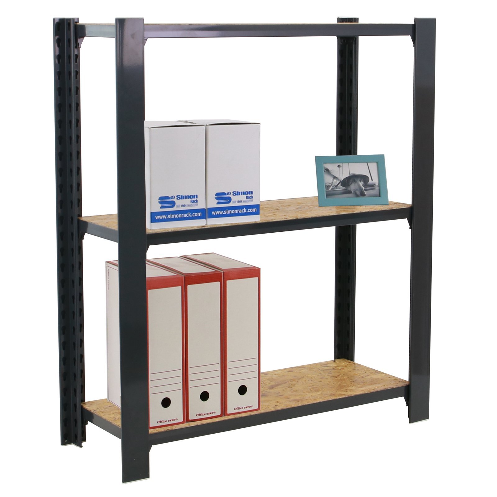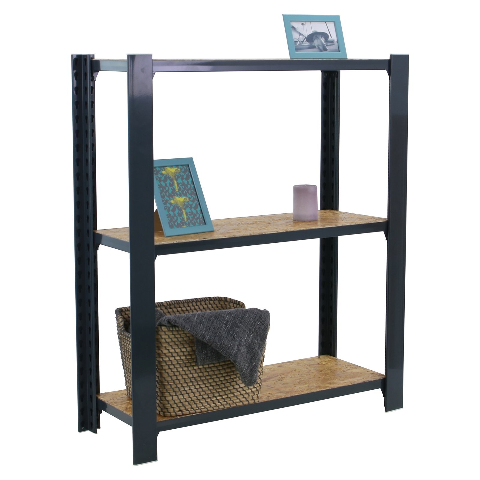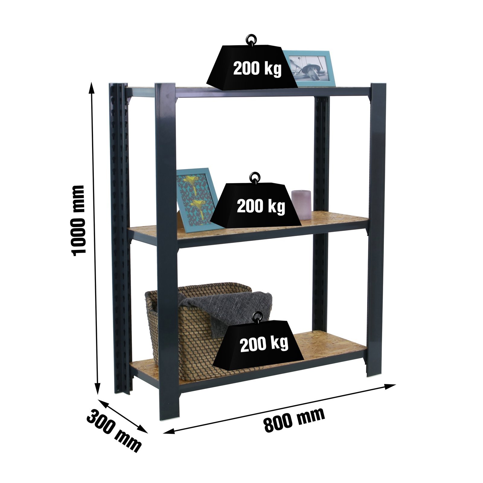 Estanteria metalica sin tornillos de color ANTRACITA/OSB con capacidad de carga por estante de 200 kg, certificacion a punto de flexion. modulo inicial con bandejas de OSB (tableros de virutas orientadas), tableros de alto rendimiento de grosor de 15 mm. Muy versatil enfocado a la decoracion actual, donde su llamativo aspecto juega a su favor ya que por su apariencia industrial empasta completamente en ambientes modernos o vintage. El numero de estantes es 3 y las medidas del producto (alto x ancho x fondo) son 1000x800x300 mm. Tiene perfil doble y en forma de T. Perfiles con recubrimiento epoxypoliester. No tiene aristas de corte, manipulacion sin riesgo. No se tambalea y no necesita anclaje a la pared. Producto europeo, calidad europea, podras encontrar las instrucciones de montaje en su interior