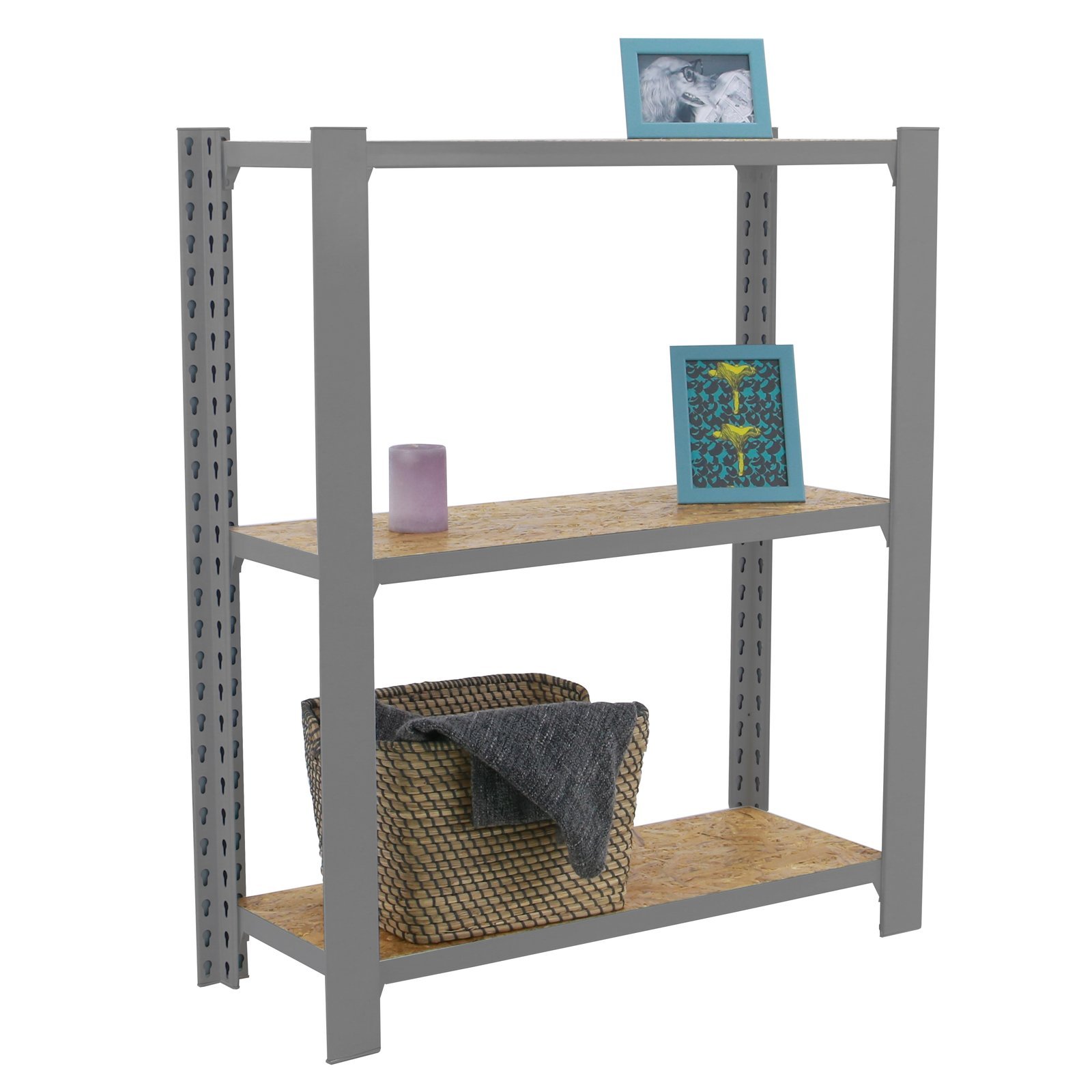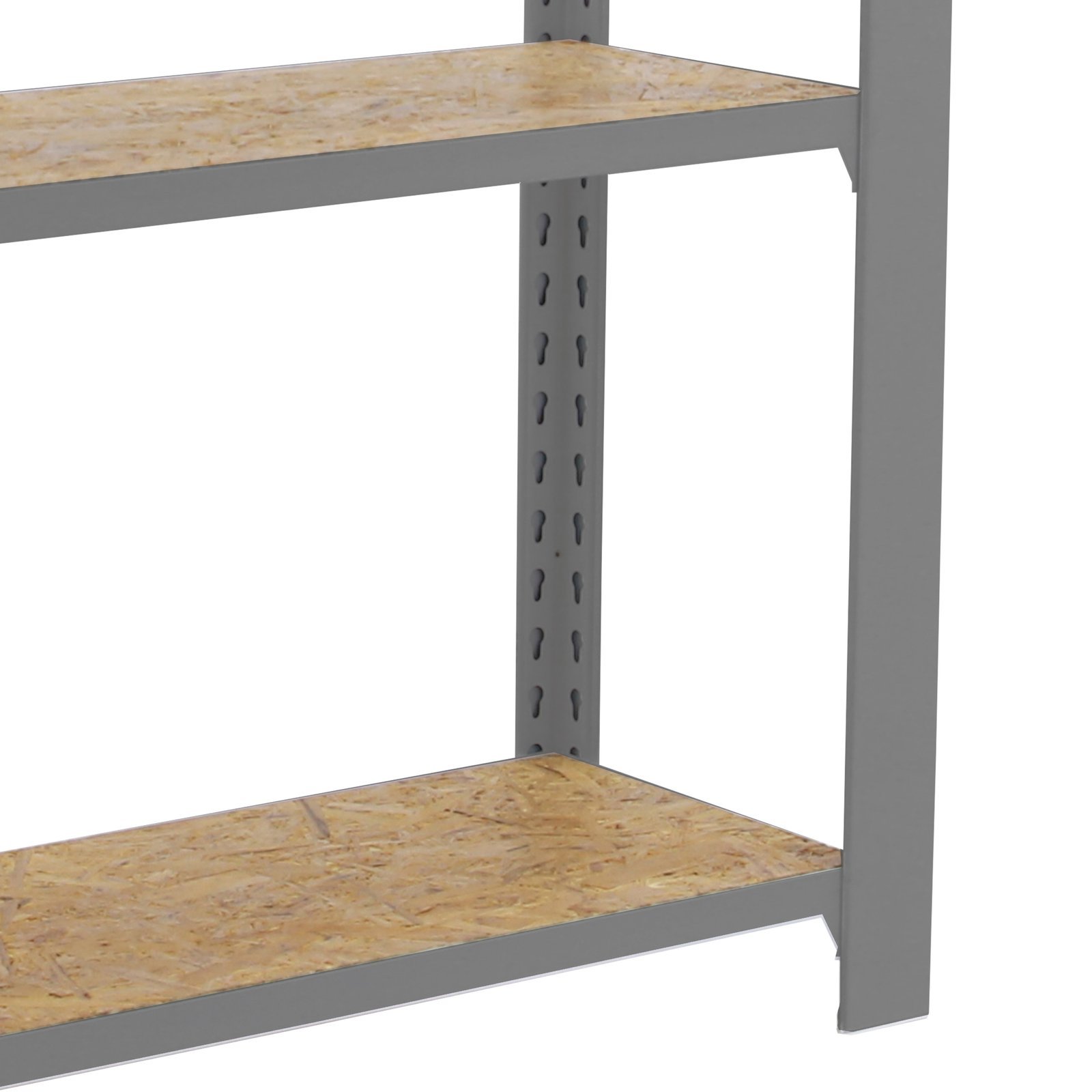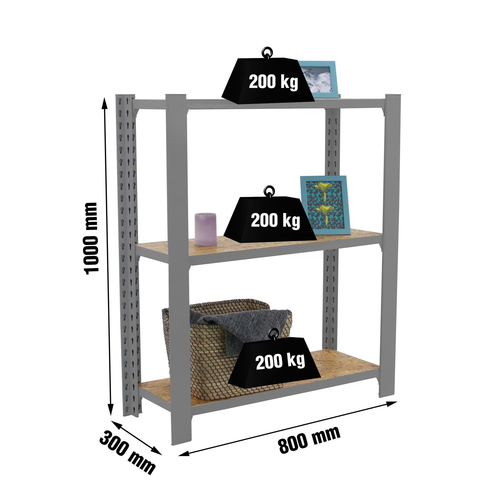 Estanteria metalica sin tornillos de color GRIS/OSB con capacidad de carga por estante de 200 kg, certificacion a punto de flexion. modulo inicial con bandejas de OSB (tableros de virutas orientadas), tableros de alto rendimiento de grosor de 15 mm. Muy versatil enfocado a la decoracion actual, donde su llamativo aspecto juega a su favor ya que por su apariencia industrial empasta completamente en ambientes modernos o vintage. El numero de estantes es 3 y las medidas del producto (alto x ancho x fondo) son 1000x800x300 mm. Tiene perfil doble y en forma de T. Perfiles con recubrimiento epoxypoliester. No tiene aristas de corte, manipulacion sin riesgo. No se tambalea y no necesita anclaje a la pared. Producto europeo, calidad europea, podras encontrar las instrucciones de montaje en su interior