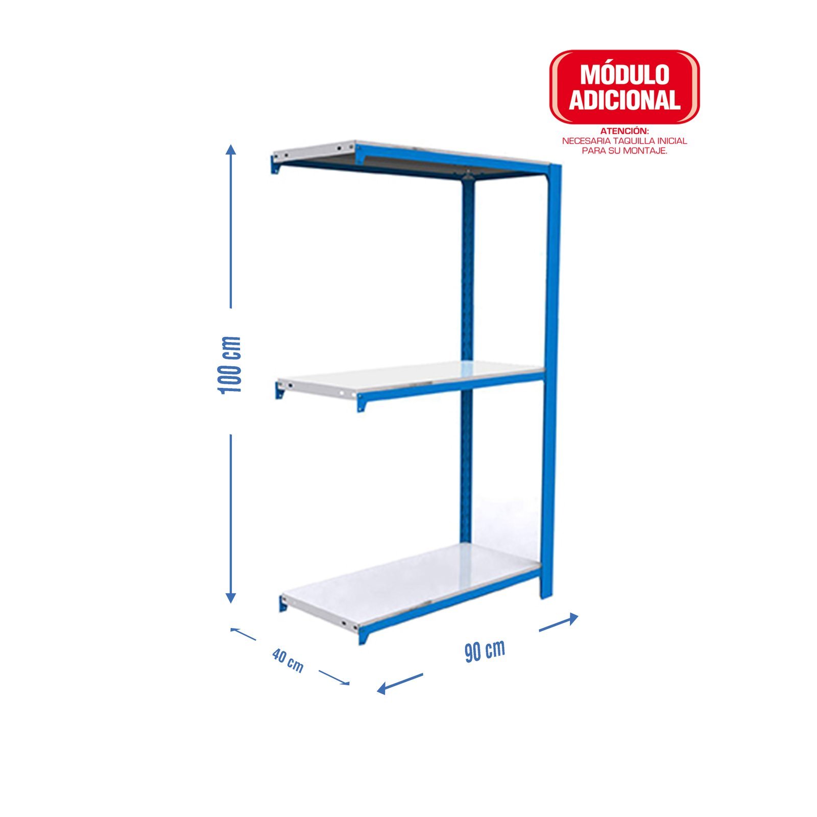 Estanteria metalica sin tornillos de color AZUL/BLANCO con capacidad de carga por estante de 200 kg. El numero de estantes es 3 y las medidas (alto x ancho x fondo) son 1000x900x400 mm. Tiene perfil doble y en forma de T. Producto europeo, calidad europea, podras encontrar las instrucciones de montaje en su interior. Medidas en uso del producto, 995x910x410 mm