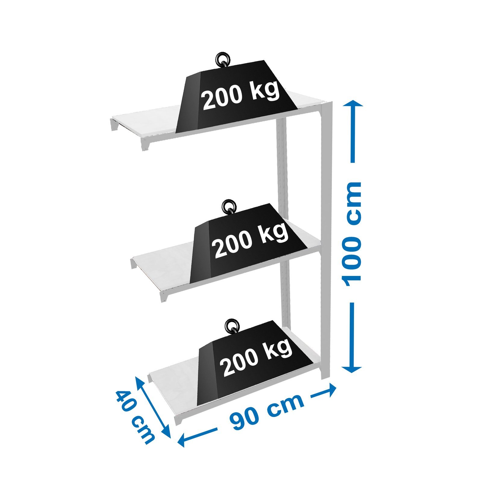 Estanteria metalica sin tornillos de color GRIS/BLANCO con capacidad de carga por estante de 200 kg. El numero de estantes es 3 y las medidas (alto x ancho x fondo) son 1000x900x400 mm. Tiene perfil doble y en forma de T. Producto europeo, calidad europea, podras encontrar las instrucciones de montaje en su interior. Medidas en uso del producto, 995x910x410 mm