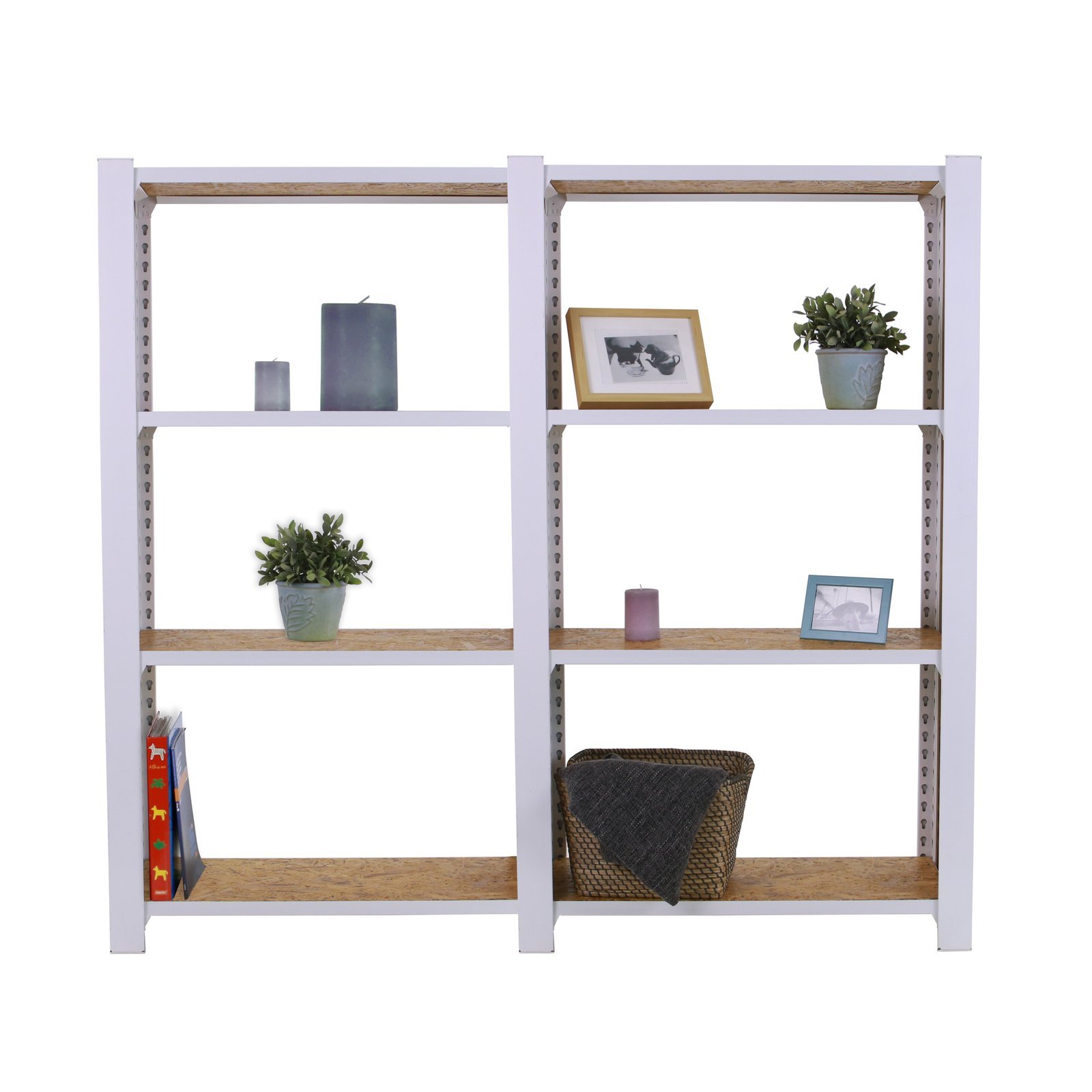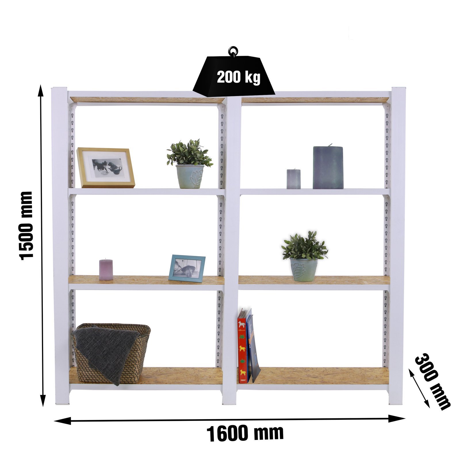 Estanteria metalica sin tornillos de color BLANCO/OSB con capacidad de carga por estante de 200 kg, certificacion a punto de flexion. Incluye tapas laterales de 1500 mm de alto. Son 2 modulos con bandejas de OSB (tableros de virutas orientadas), tableros de alto rendimiento de grosor de 15 mm. Muy versatil enfocado a la decoracion actual, donde su llamativo aspecto juega a su favor ya que por su apariencia industrial empasta completamente en ambientes modernos o vintage. El numero de estantes de cada modulo es 4 (4×2 modulos= 8 estantes) y las medidas del producto (alto x ancho x fondo) son 1500x1600x300 mm. Tiene perfil doble y en forma de T. Perfiles con recubrimiento epoxypoliester. No tiene aristas de corte, manipulacion sin riesgo. No se tambalea y no necesita anclaje a la pared. Producto europeo, calidad europea, podras encontrar las instrucciones de montaje en su interior