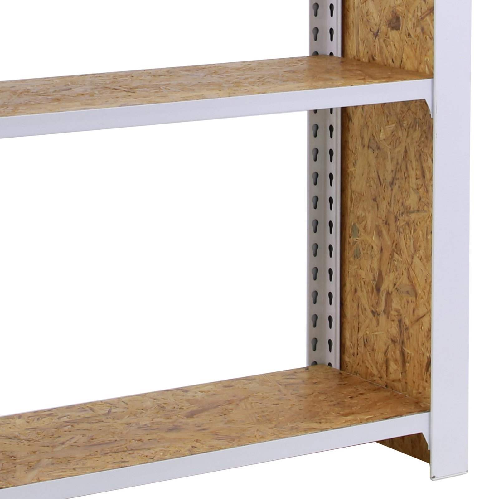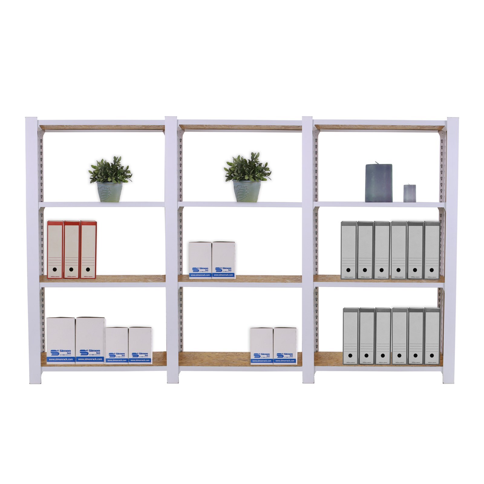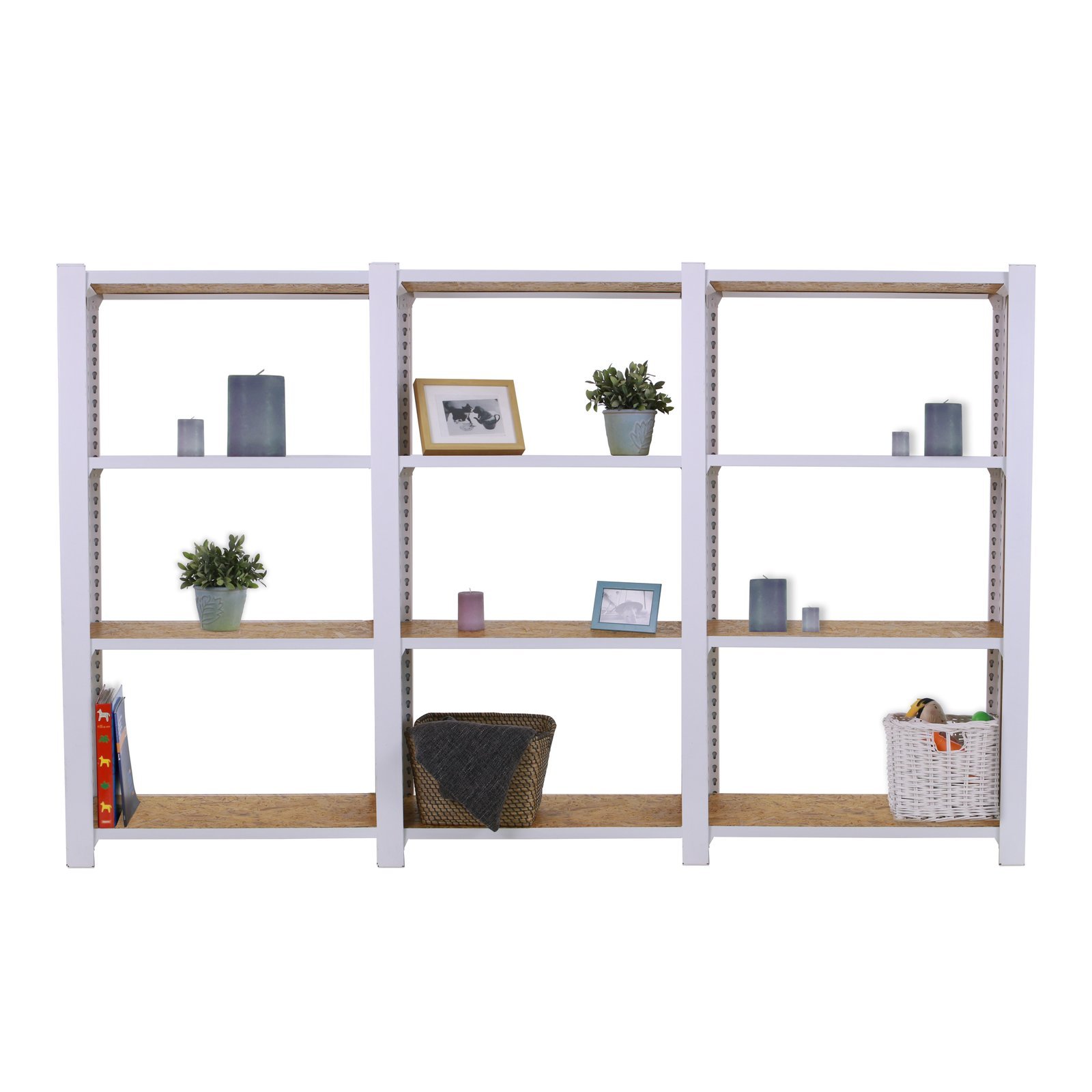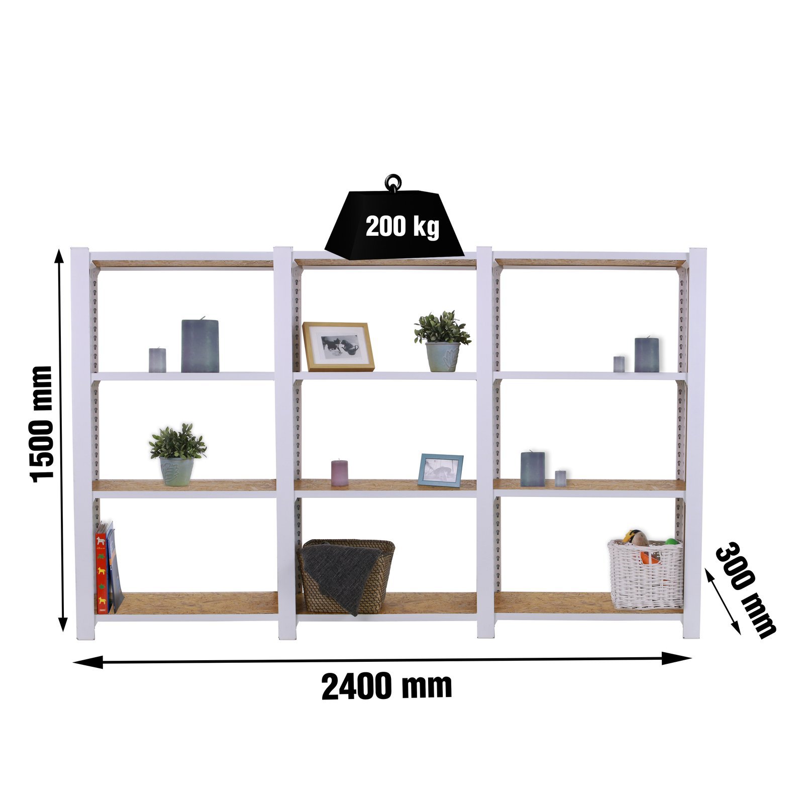 Estanteria metalica sin tornillos de color BLANCO/OSB con capacidad de carga por estante de 200 kg, certificacion a punto de flexion. Incluye tapas laterales de 1500 mm de alto. Son 3 modulos con bandejas de OSB (tableros de virutas orientadas), tableros de alto rendimiento de grosor de 15 mm. Muy versatil enfocado a la decoracion actual, donde su llamativo aspecto juega a su favor ya que por su apariencia industrial empasta completamente en ambientes modernos o vintage. El numero de estantes de cada modulo es 4 (4×3 modulos= 12 estantes) y las medidas del producto (alto x ancho x fondo) son 1500x2400x300 mm. Tiene perfil doble y en forma de T. Perfiles con recubrimiento epoxypoliester. No tiene aristas de corte, manipulacion sin riesgo. No se tambalea y no necesita anclaje a la pared. Producto europeo, calidad europea, podras encontrar las instrucciones de montaje en su interior