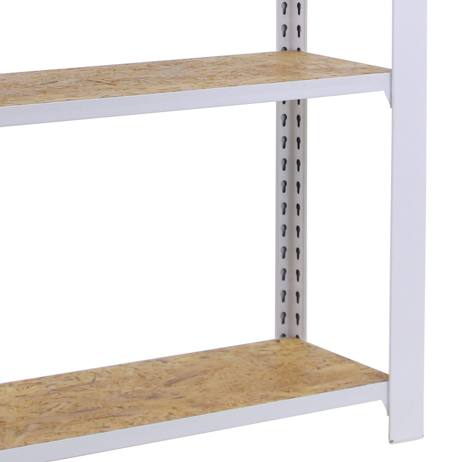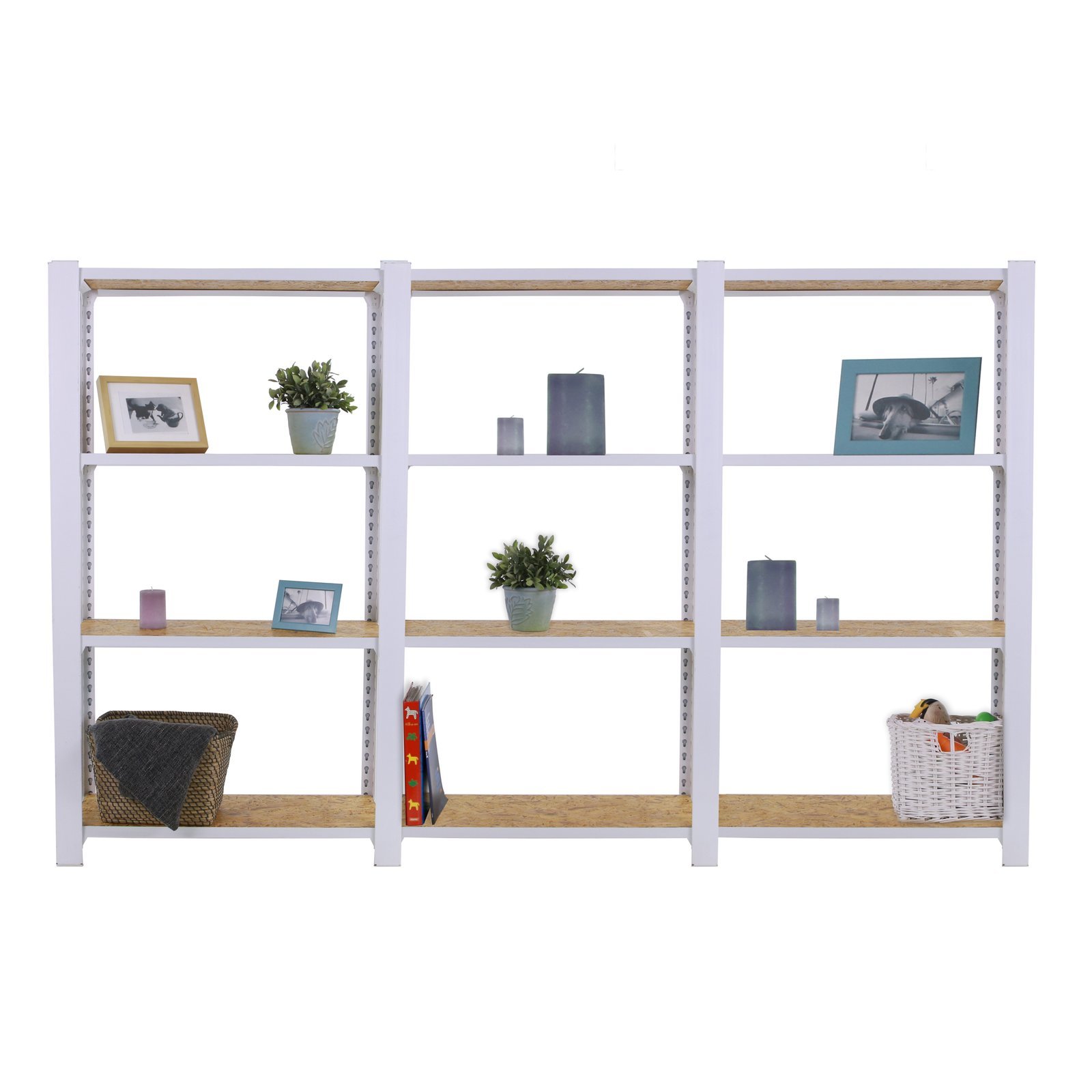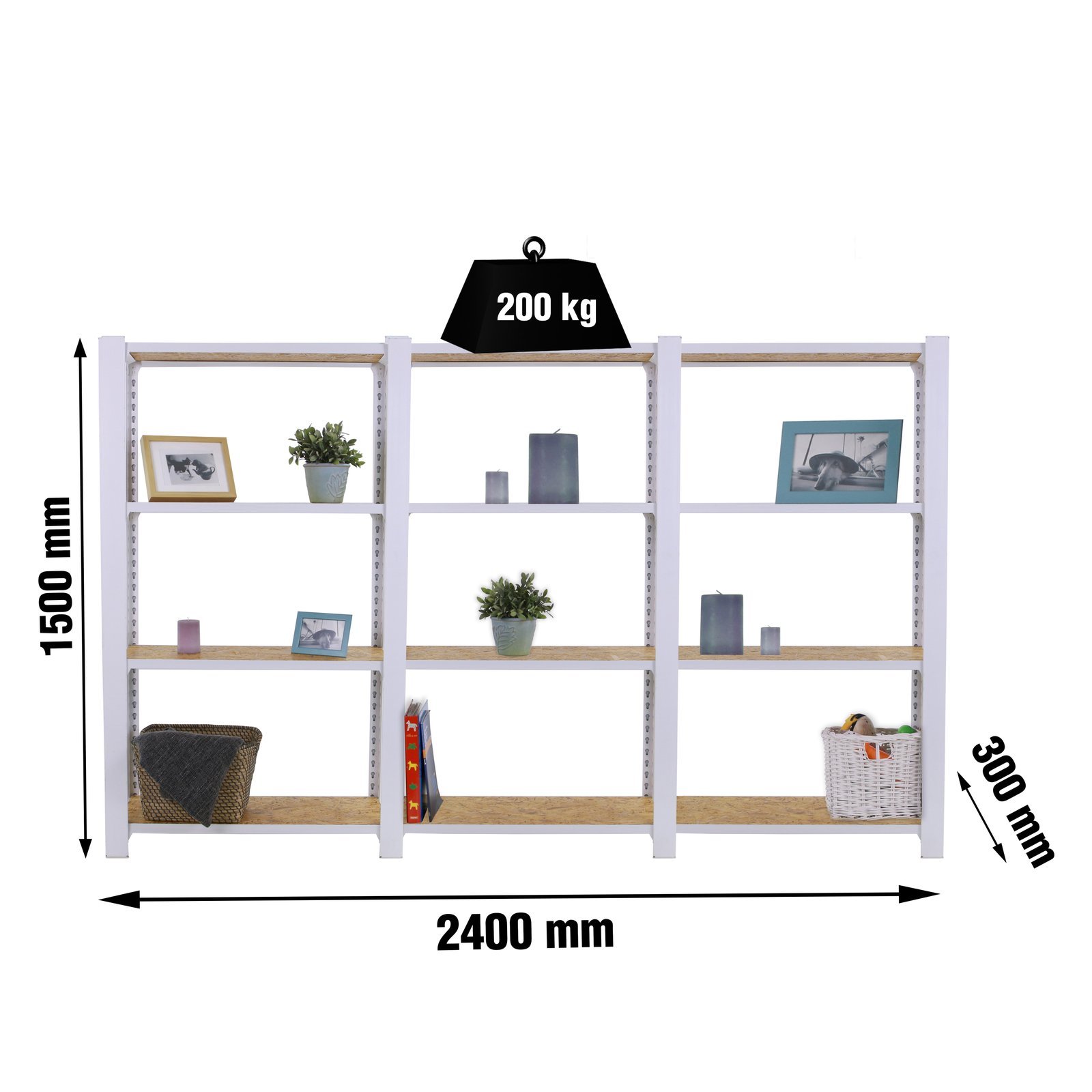 Estanteria metalica sin tornillos de color BLANCO/OSB con capacidad de carga por estante de 200 kg, certificacion a punto de flexion. Son 3 modulos con bandejas de OSB (tableros de virutas orientadas), tableros de alto rendimiento de grosor de 15 mm. Muy versatil enfocado a la decoracion actual, donde su llamativo aspecto juega a su favor ya que por su apariencia industrial empasta completamente en ambientes modernos o vintage. El numero de estantes de cada modulo es 4 (4×3 modulos= 12 estantes) y las medidas del producto (alto x ancho x fondo) son 1500x2400x300 mm. Tiene perfil doble y en forma de T. Perfiles con recubrimiento epoxypoliester. No tiene aristas de corte, manipulacion sin riesgo. No se tambalea y no necesita anclaje a la pared. Producto europeo, calidad europea, podras encontrar las instrucciones de montaje en su interior