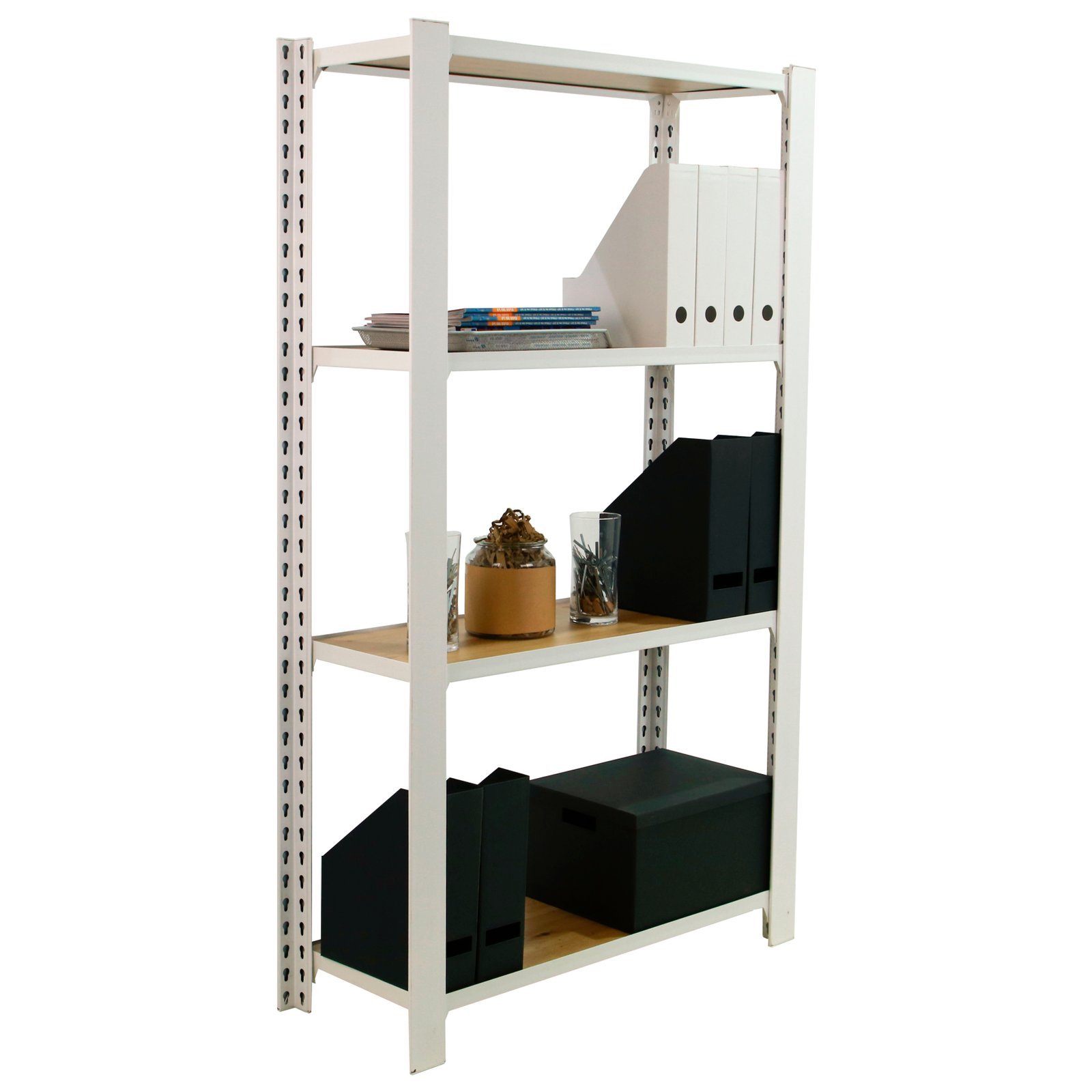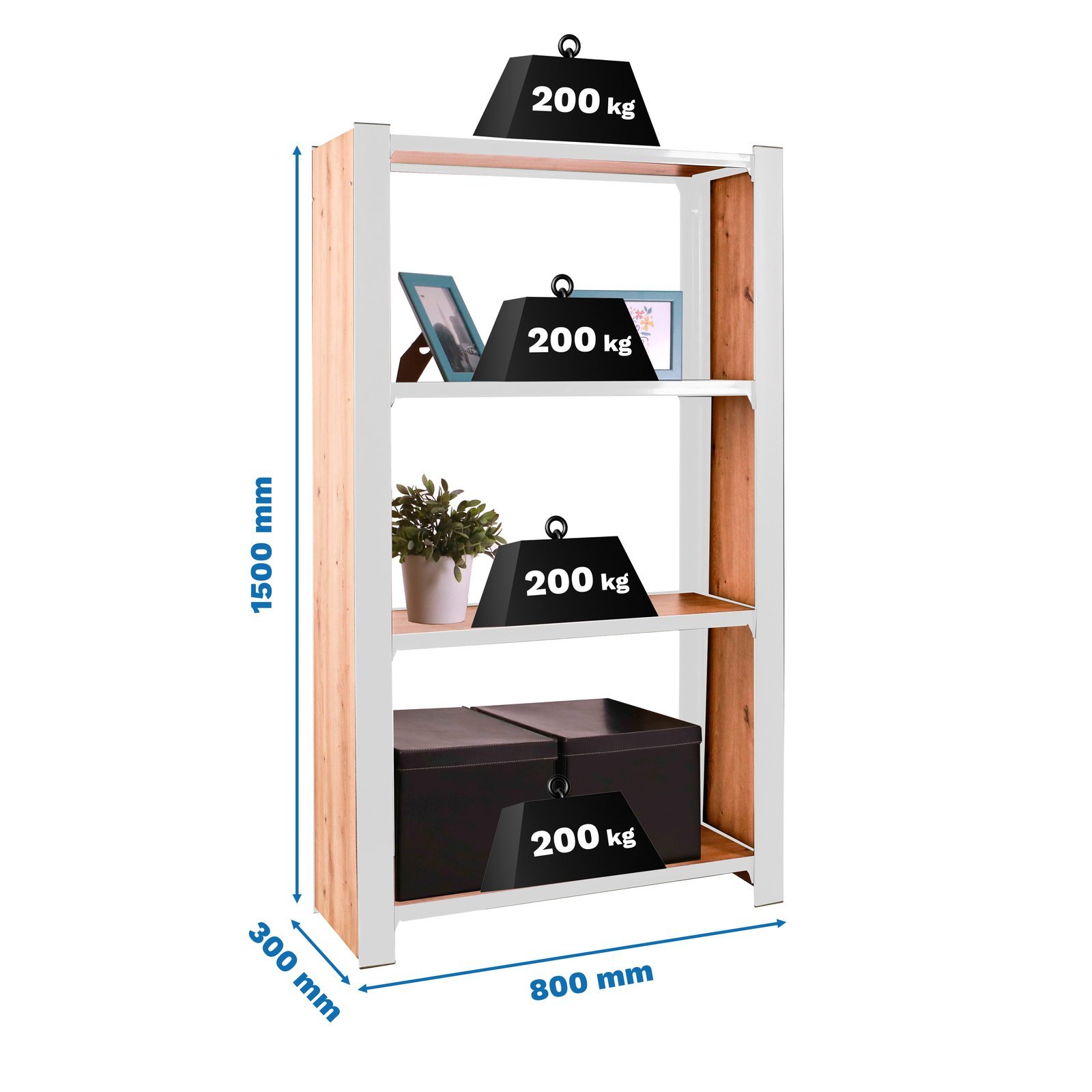 Estanteria metalica sin tornillos de color BLANCO/ROBLE con capacidad de carga por estante de 200 kg, certificacion a punto de flexion. modulo inicial con bandejas de madera contrachapada. Muy versatil, enfocado a la decoracion actual, donde su llamativo aspecto juega a su favor ya que por su apariencia industrial empasta completamente en ambientes modernos o vintage. El numero de estantes es 4 y las medidas del producto (alto x ancho x fondo) son 1500x800x300 mm. Tiene perfil doble y en forma de T. Perfiles con recubrimiento epoxypoliester. No tiene aristas de corte, manipulacion sin riesgo. No se tambalea y no necesita anclaje a la pared. Producto europeo, calidad europea, podras encontrar las instrucciones de montaje en su interior