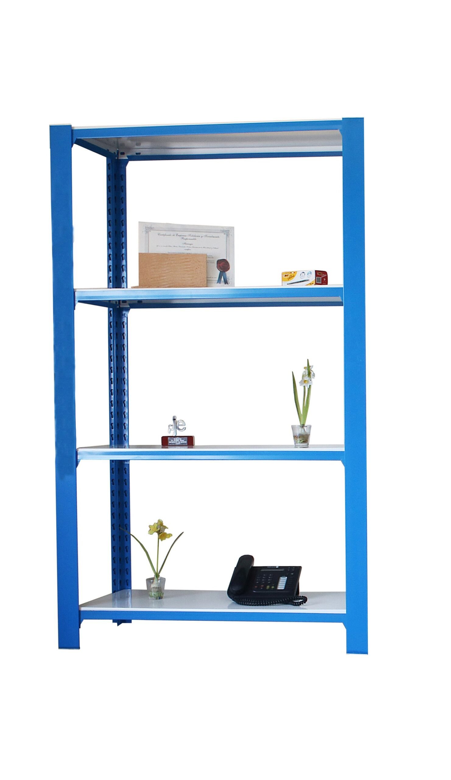 Estanteria metalica sin tornillos de color AZUL/BLANCO con capacidad de carga por estante de 200 kg. modulo inicial con bandejas de madera. El numero de estantes es 4 y las medidas (alto x ancho x fondo) son 1500x900x300 mm. Tiene perfil doble y en forma de T. Producto europeo, calidad europea, podras encontrar las instrucciones de montaje en su interior. Medidas en uso del producto, 1495x910x310 mm