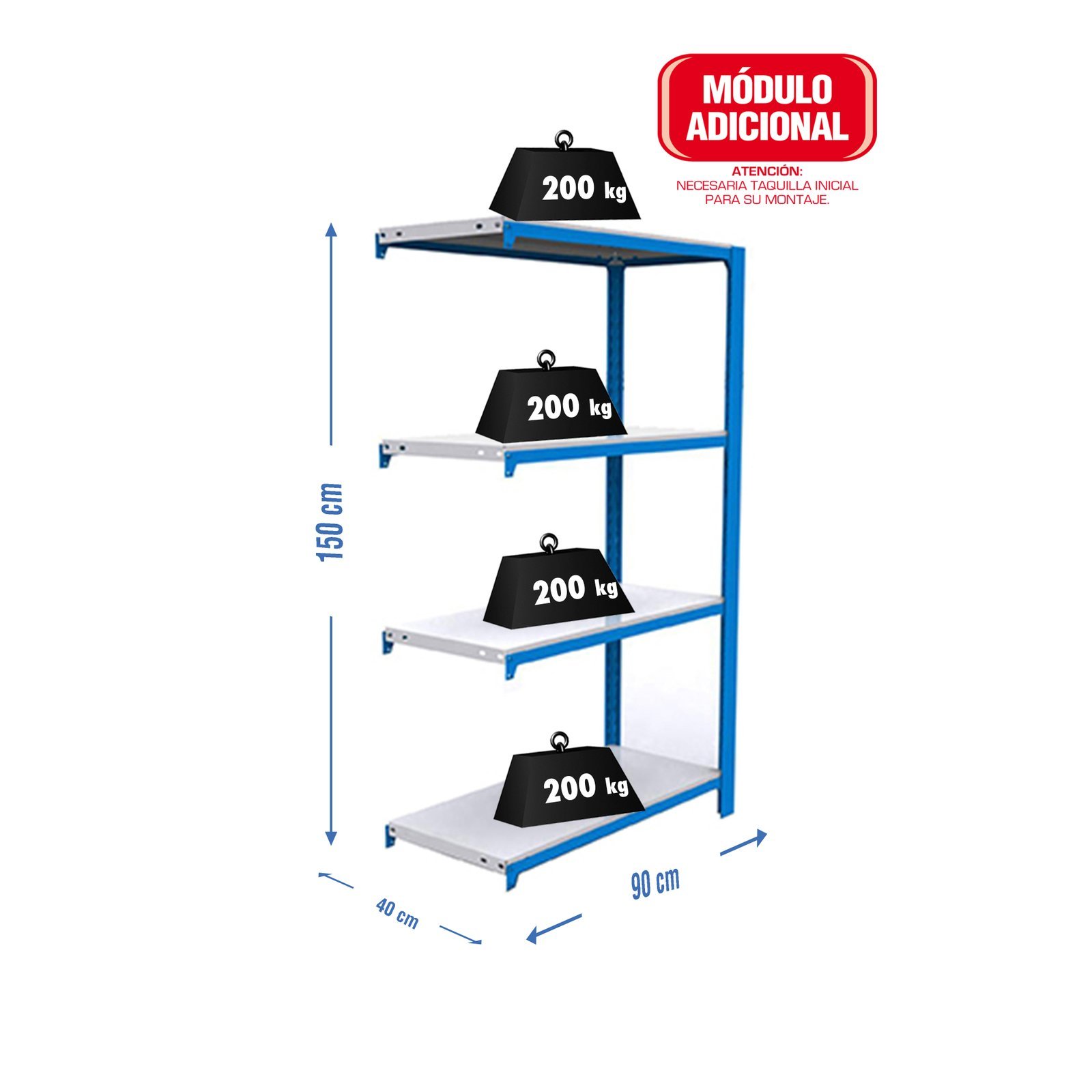 Estanteria metalica sin tornillos de color AZUL/BLANCO con capacidad de carga por estante de 200 kg. El numero de estantes es 4 y las medidas (alto x ancho x fondo) son 1500x900x400 mm. Tiene perfil doble y en forma de T. Producto europeo, calidad europea, podras encontrar las instrucciones de montaje en su interior. Medidas en uso del producto, 1495x910x410 mm