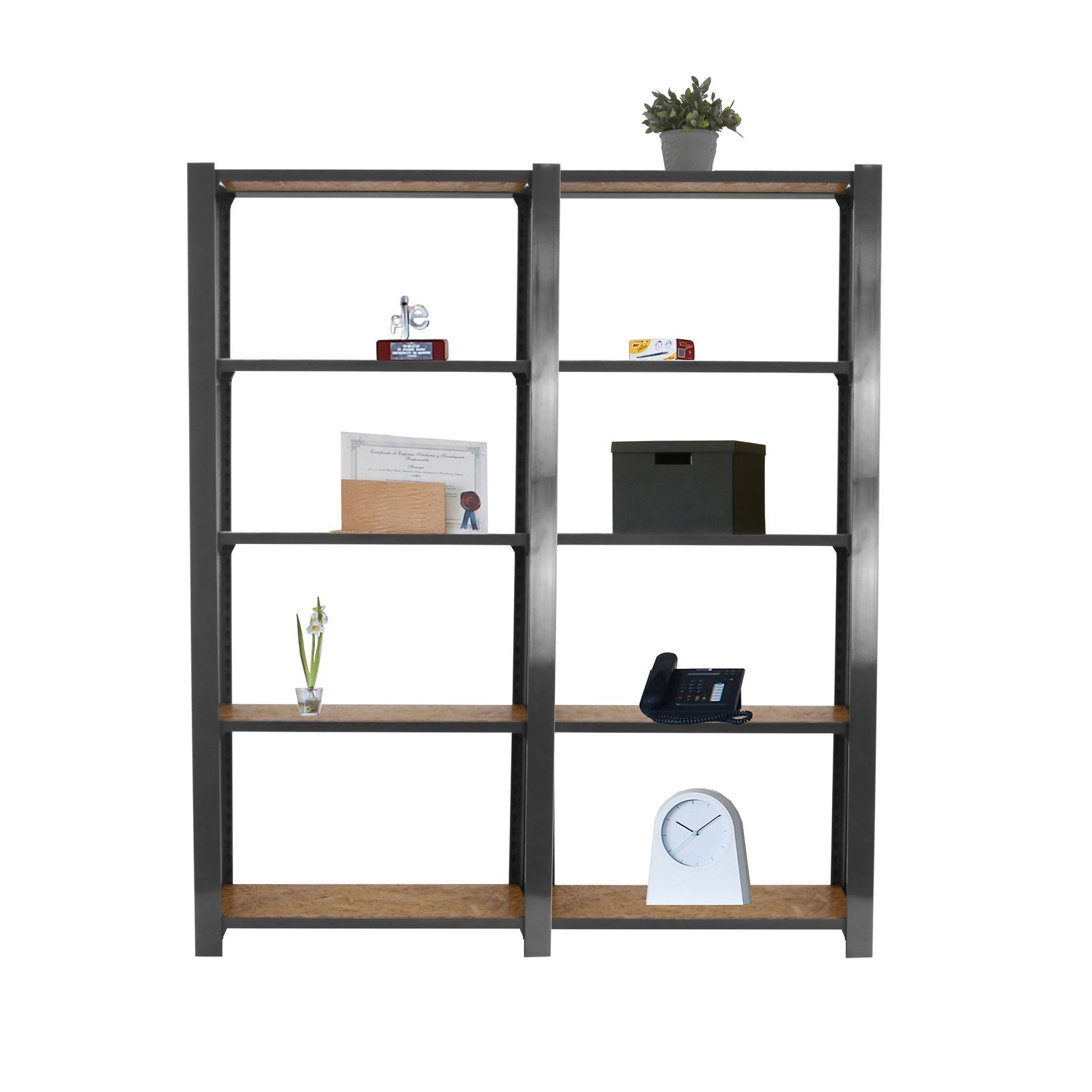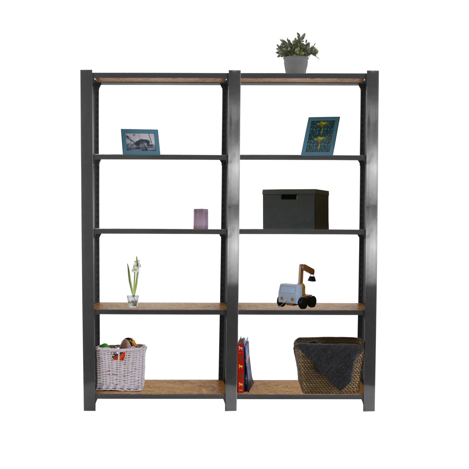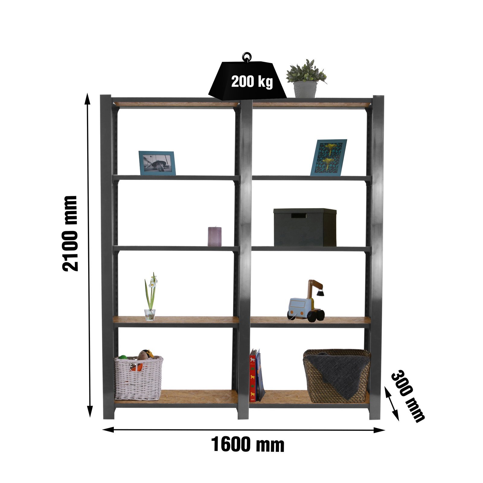 Estanteria metalica sin tornillos de color GRIS/OSB con capacidad de carga por estante de 200 kg, certificacion a punto de flexion. Incluye tapas laterales de 2100 mm de alto. Son 2 modulos con bandejas de OSB (tableros de virutas orientadas), tableros de alto rendimiento de grosor de 15 mm. Muy versatil enfocado a la decoracion actual, donde su llamativo aspecto juega a su favor ya que por su apariencia industrial empasta completamente en ambientes modernos o vintage. El numero de estantes de cada modulo es 5 (5×2 modulos= 10 estantes) y las medidas del producto (alto x ancho x fondo) son 2100x1600x300 mm. Tiene perfil doble y en forma de T. Perfiles con recubrimiento epoxypoliester. No tiene aristas de corte, manipulacion sin riesgo. No se tambalea y no necesita anclaje a la pared. Producto europeo, calidad europea, podras encontrar las instrucciones de montaje en su interior