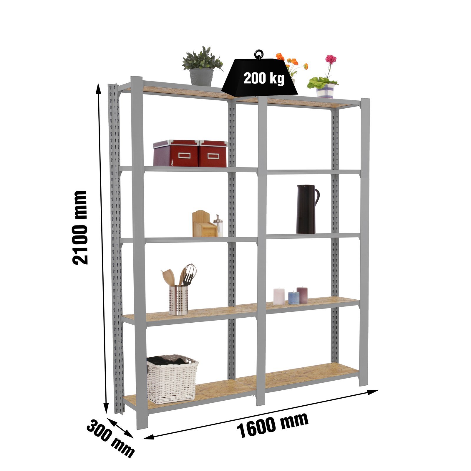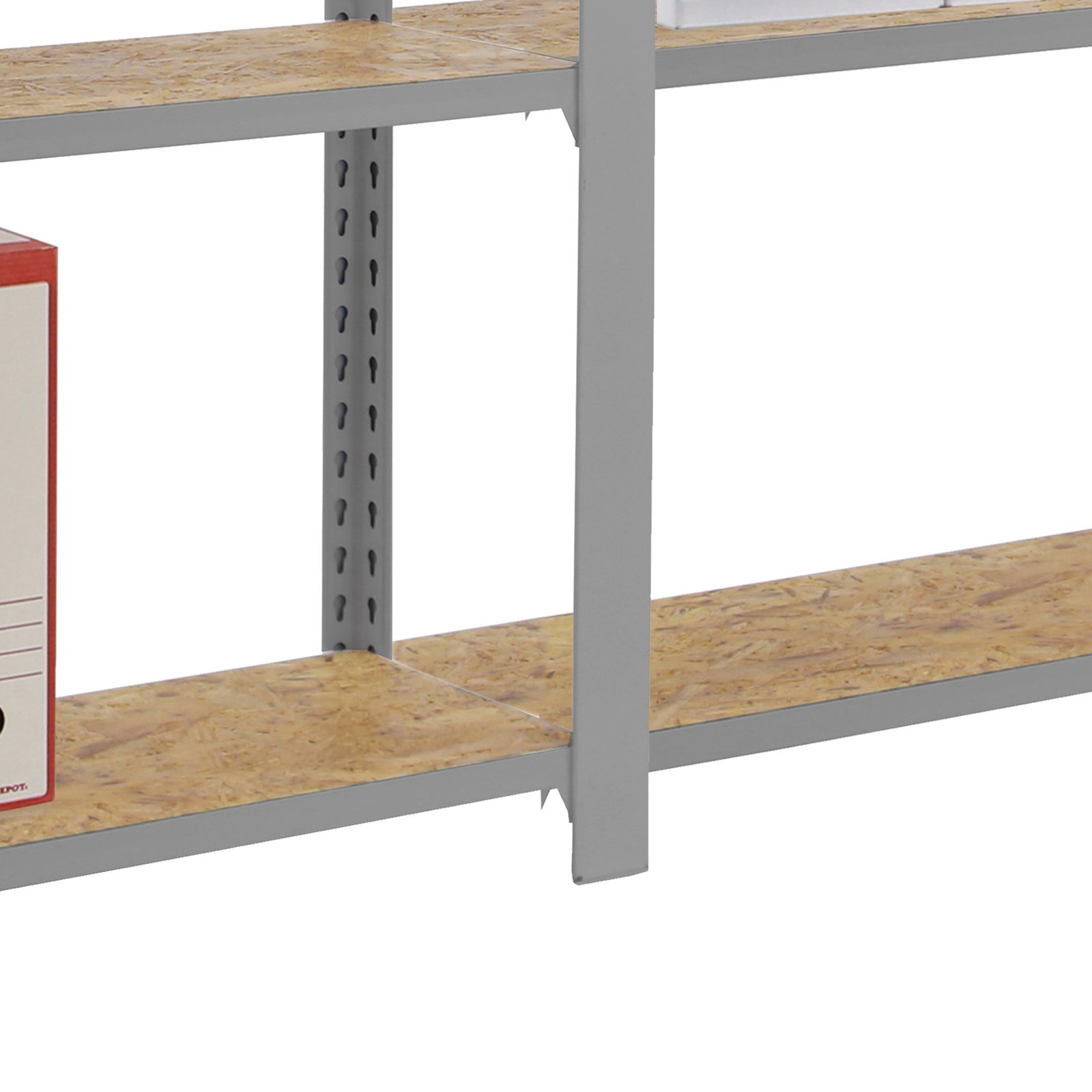 Estanteria metalica sin tornillos de color GRIS/OSB con capacidad de carga por estante de 200 kg, certificacion a punto de flexion. Son 2 modulos con bandejas de OSB (tableros de virutas orientadas), tableros de alto rendimiento de grosor de 15 mm. Muy versatil enfocado a la decoracion actual, donde su llamativo aspecto juega a su favor ya que por su apariencia industrial empasta completamente en ambientes modernos o vintage. El numero de estantes de cada modulo es 5 (5×2 modulos= 10 estantes) y las medidas del producto (alto x ancho x fondo) son 2100x1600x300 mm. Tiene perfil doble y en forma de T. Perfiles con recubrimiento epoxypoliester. No tiene aristas de corte, manipulacion sin riesgo. No se tambalea y no necesita anclaje a la pared. Producto europeo, calidad europea, podras encontrar las instrucciones de montaje en su interior