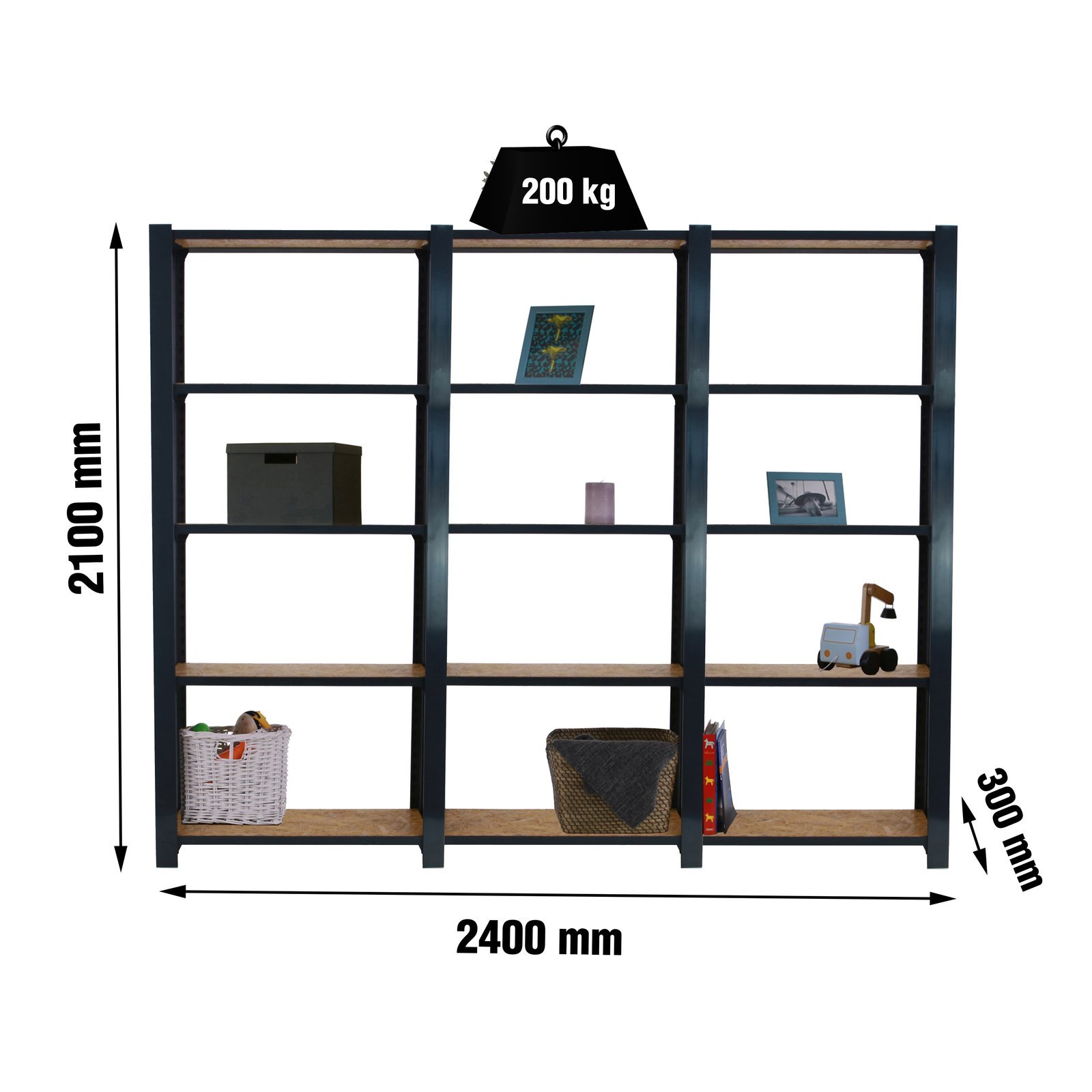 Estanteria metalica sin tornillos de color ANTRACITA/OSB con capacidad de carga por estante de 200 kg, certificacion a punto de flexion. Incluye tapas laterales de 2100 mm de alto. Son 3 modulos con bandejas de OSB (tableros de virutas orientadas), tableros de alto rendimiento de grosor de 15 mm. Muy versatil enfocado a la decoracion actual, donde su llamativo aspecto juega a su favor ya que por su apariencia industrial empasta completamente en ambientes modernos o vintage. El numero de estantes de cada modulo es 5 (5×3 modulos= 15 estantes) y las medidas del producto (alto x ancho x fondo) son 2100x2400x300 mm. Tiene perfil doble y en forma de T. Perfiles con recubrimiento epoxypoliester. No tiene aristas de corte, manipulacion sin riesgo. No se tambalea y no necesita anclaje a la pared. Producto europeo, calidad europea, podras encontrar las instrucciones de montaje en su interior