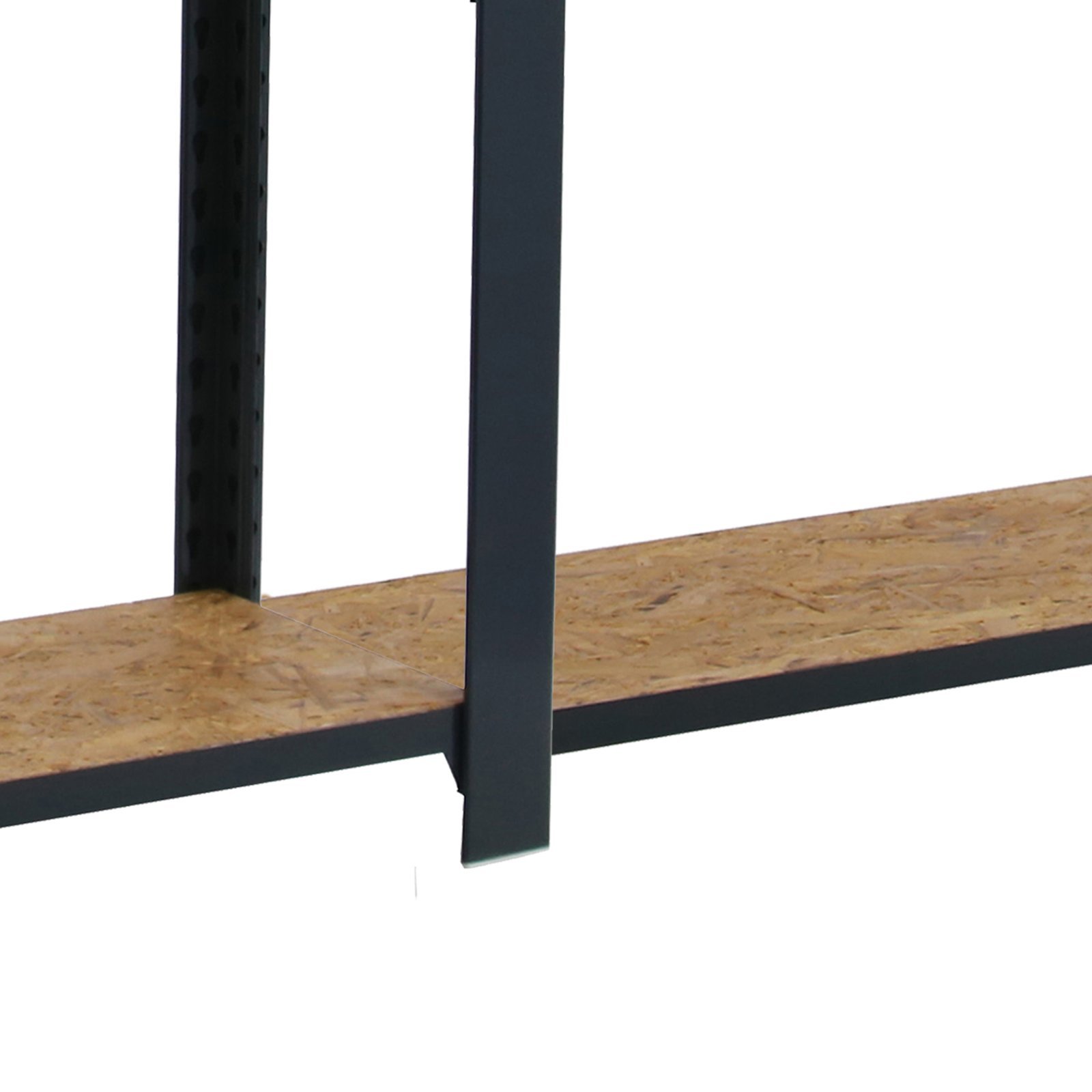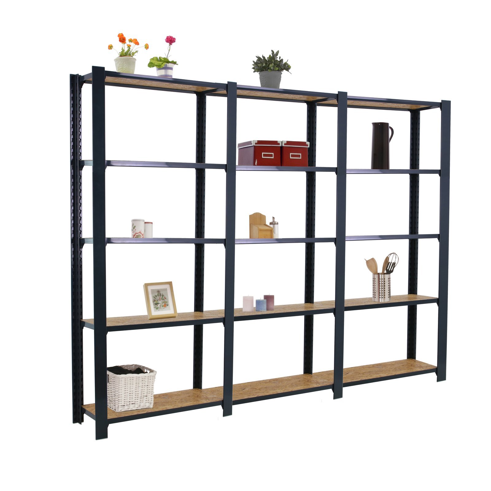 Estanteria metalica sin tornillos de color ANTRACITA/OSB con capacidad de carga por estante de 200 kg, certificacion a punto de flexion. Son 3 modulos con bandejas de OSB (tableros de virutas orientadas), tableros de alto rendimiento de grosor de 15 mm. Muy versatil enfocado a la decoracion actual, donde su llamativo aspecto juega a su favor ya que por su apariencia industrial empasta completamente en ambientes modernos o vintage. El numero de estantes de cada modulo es 5 (5×3 modulos= 15 estantes) y las medidas del producto (alto x ancho x fondo) son 2100x2400x300 mm. Tiene perfil doble y en forma de T. Perfiles con recubrimiento epoxypoliester. No tiene aristas de corte, manipulacion sin riesgo. No se tambalea y no necesita anclaje a la pared. Producto europeo, calidad europea, podras encontrar las instrucciones de montaje en su interior