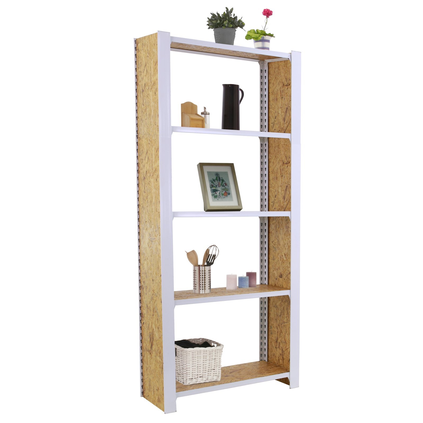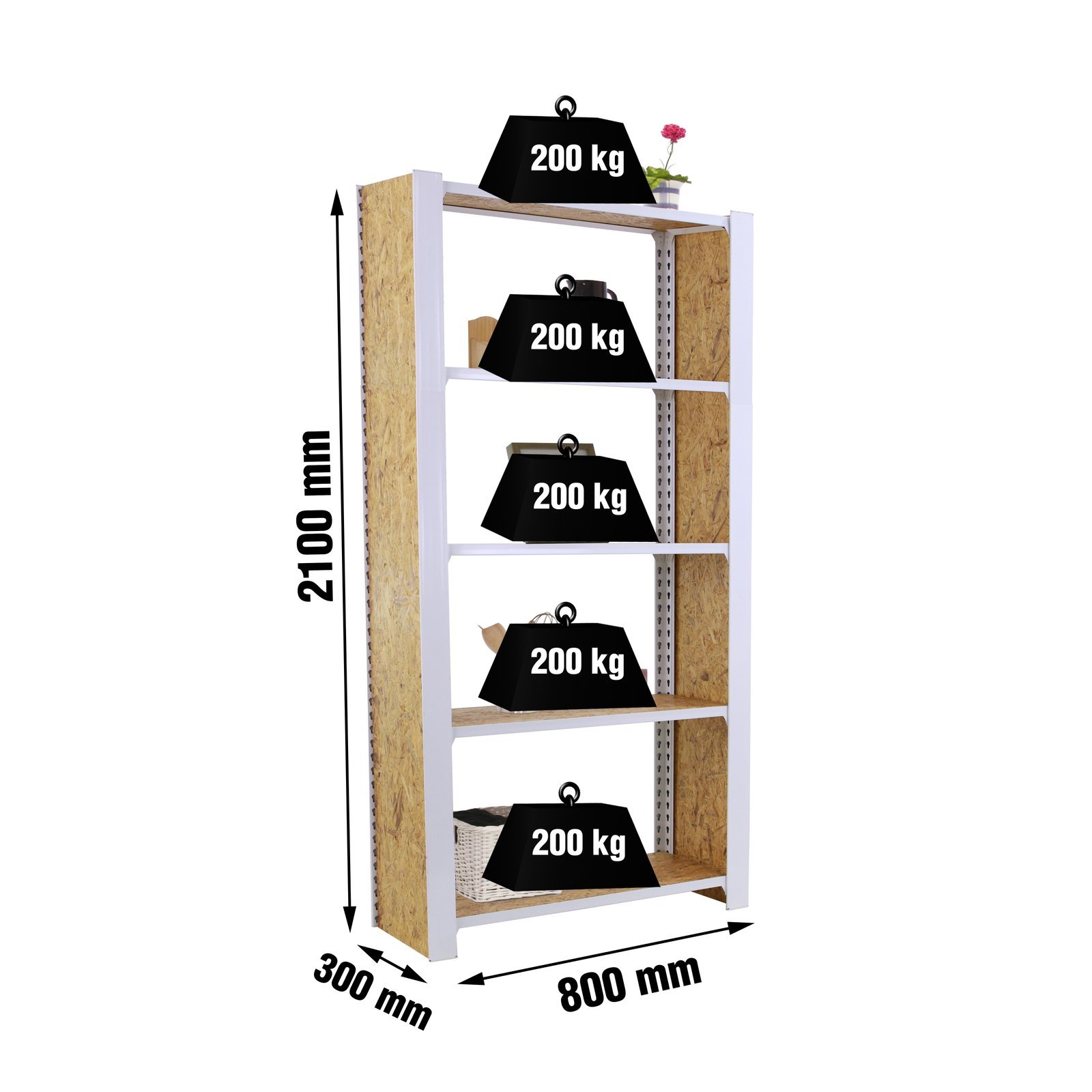 Estanteria metalica sin tornillos de color BLANCO/OSB con capacidad de carga por estante de 200 kg, certificacion a punto de flexion. Incluye tapas laterales de 2100 mm de alto. modulo inicial con bandejas de OSB (tableros de virutas orientadas), tableros de alto rendimiento de grosor de 15 mm. Muy versatil enfocado a la decoracion actual, donde su llamativo aspecto juega a su favor ya que por su apariencia industrial empasta completamente en ambientes modernos o vintage. El numero de estantes es 5 y las medidas del producto (alto x ancho x fondo) son 2100x800x300 mm. Tiene perfil doble y en forma de T. Perfiles con recubrimiento epoxypoliester. No tiene aristas de corte, manipulacion sin riesgo. No se tambalea y no necesita anclaje a la pared. Producto europeo, calidad europea, podras encontrar las instrucciones de montaje en su interior
