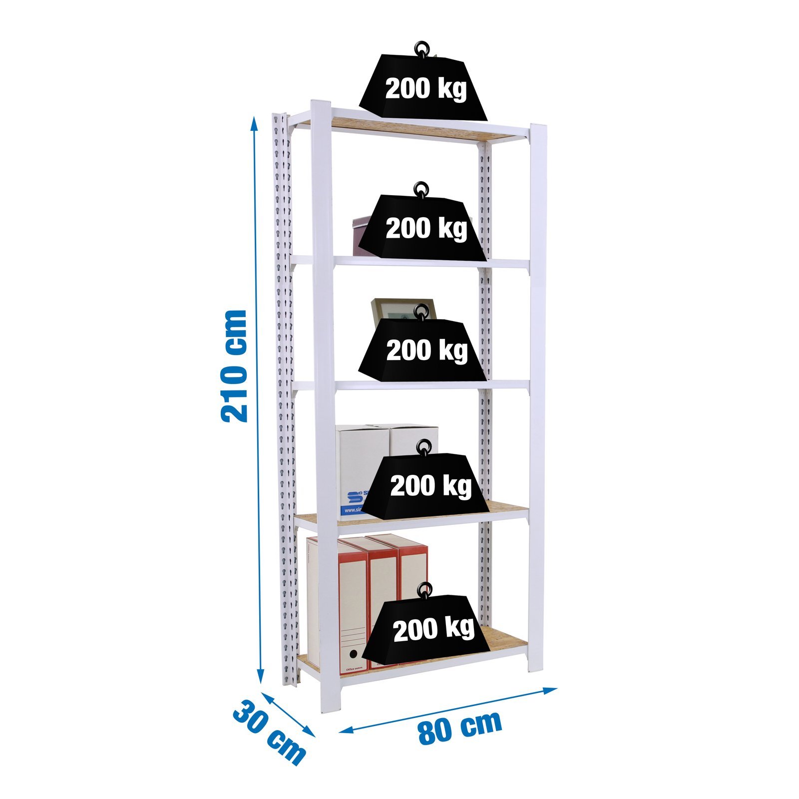 Estanteria metalica sin tornillos de color BLANCO/OSB con capacidad de carga por estante de 200 kg, certificacion a punto de flexion. modulo inicial con bandejas de OSB (tableros de virutas orientadas), tableros de alto rendimiento de grosor de 15 mm. Muy versatil enfocado a la decoracion actual, donde su llamativo aspecto juega a su favor ya que por su apariencia industrial empasta completamente en ambientes modernos o vintage. El numero de estantes es 5 y las medidas del producto (alto x ancho x fondo) son 2100x800x300 mm. Tiene perfil doble y en forma de T. Perfiles con recubrimiento epoxypoliester. No tiene aristas de corte, manipulacion sin riesgo. No se tambalea y no necesita anclaje a la pared. Producto europeo, calidad europea, podras encontrar las instrucciones de montaje en su interior