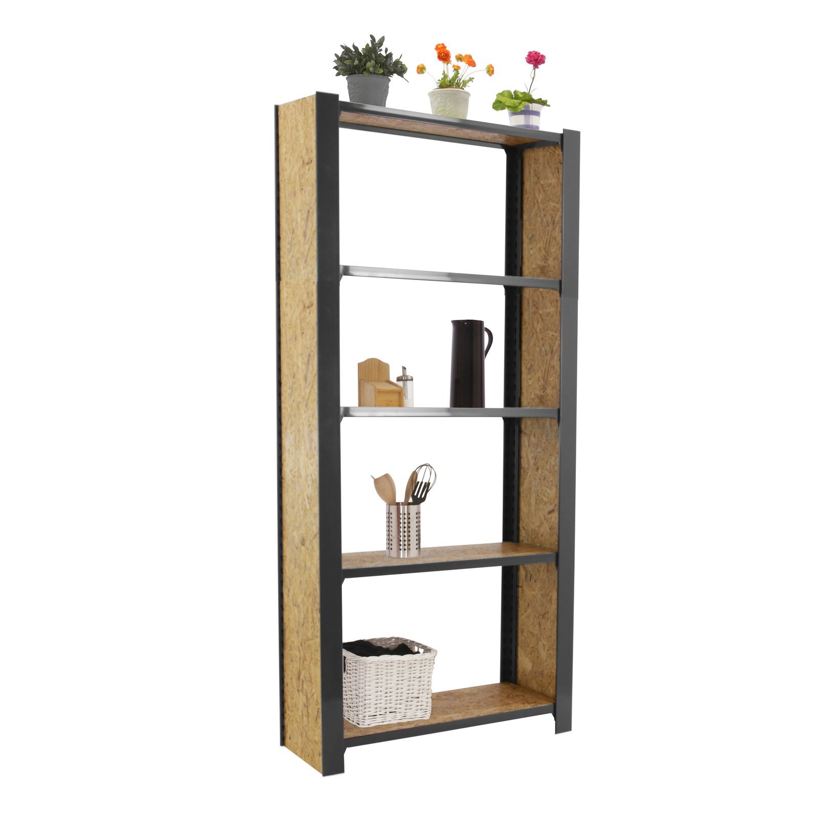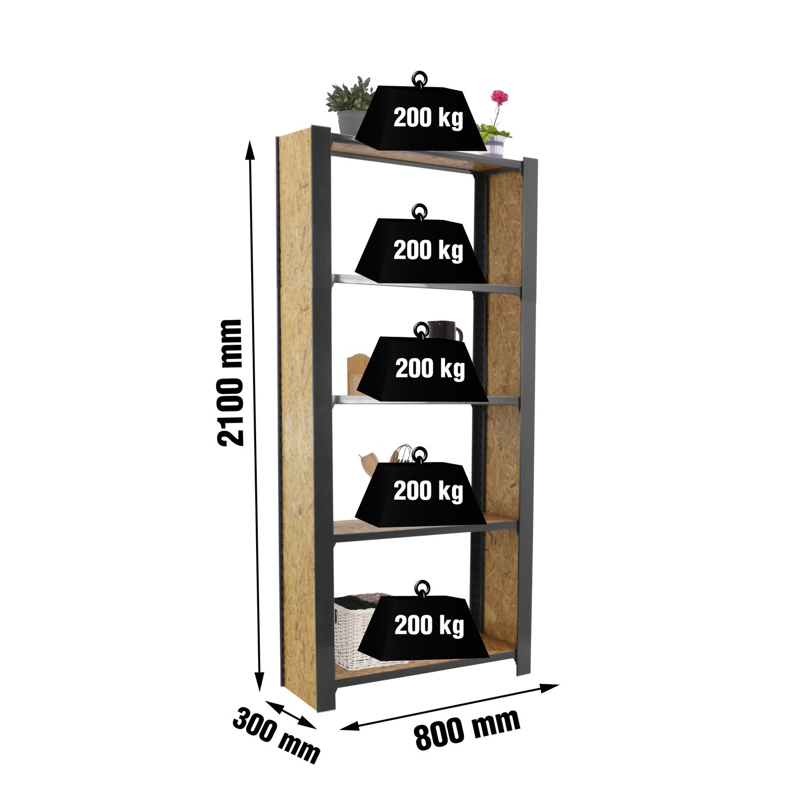 Estanteria metalica sin tornillos de color GRIS/OSB con capacidad de carga por estante de 200 kg, certificacion a punto de flexion. Incluye tapas laterales de 2100 mm de alto. modulo inicial con bandejas de OSB (tableros de virutas orientadas), tableros de alto rendimiento de grosor de 15 mm. Muy versatil enfocado a la decoracion actual, donde su llamativo aspecto juega a su favor ya que por su apariencia industrial empasta completamente en ambientes modernos o vintage. El numero de estantes es 5 y las medidas del producto (alto x ancho x fondo) son 2100x800x300 mm. Tiene perfil doble y en forma de T. Perfiles con recubrimiento epoxypoliester. No tiene aristas de corte, manipulacion sin riesgo. No se tambalea y no necesita anclaje a la pared. Producto europeo, calidad europea, podras encontrar las instrucciones de montaje en su interior