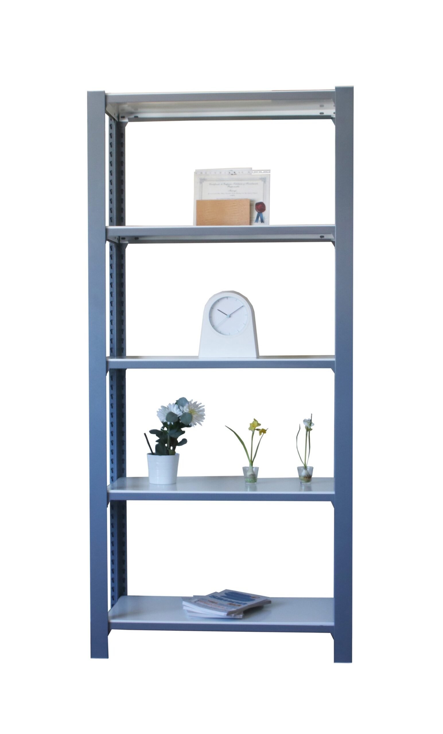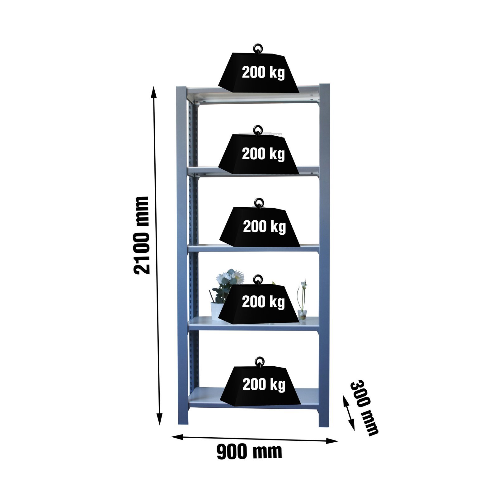 Estanteria metalica sin tornillos de color GRIS/BLANCO con capacidad de carga por estante de 200 kg. modulo inicial con bandejas de madera. El numero de estantes es 5 y las medidas (alto x ancho x fondo) son 2100x900x300 mm. Tiene perfil doble y en forma de T. Producto europeo, calidad europea, podras encontrar las instrucciones de montaje en su interior. Medidas en uso del producto, 2050x910x310 mm