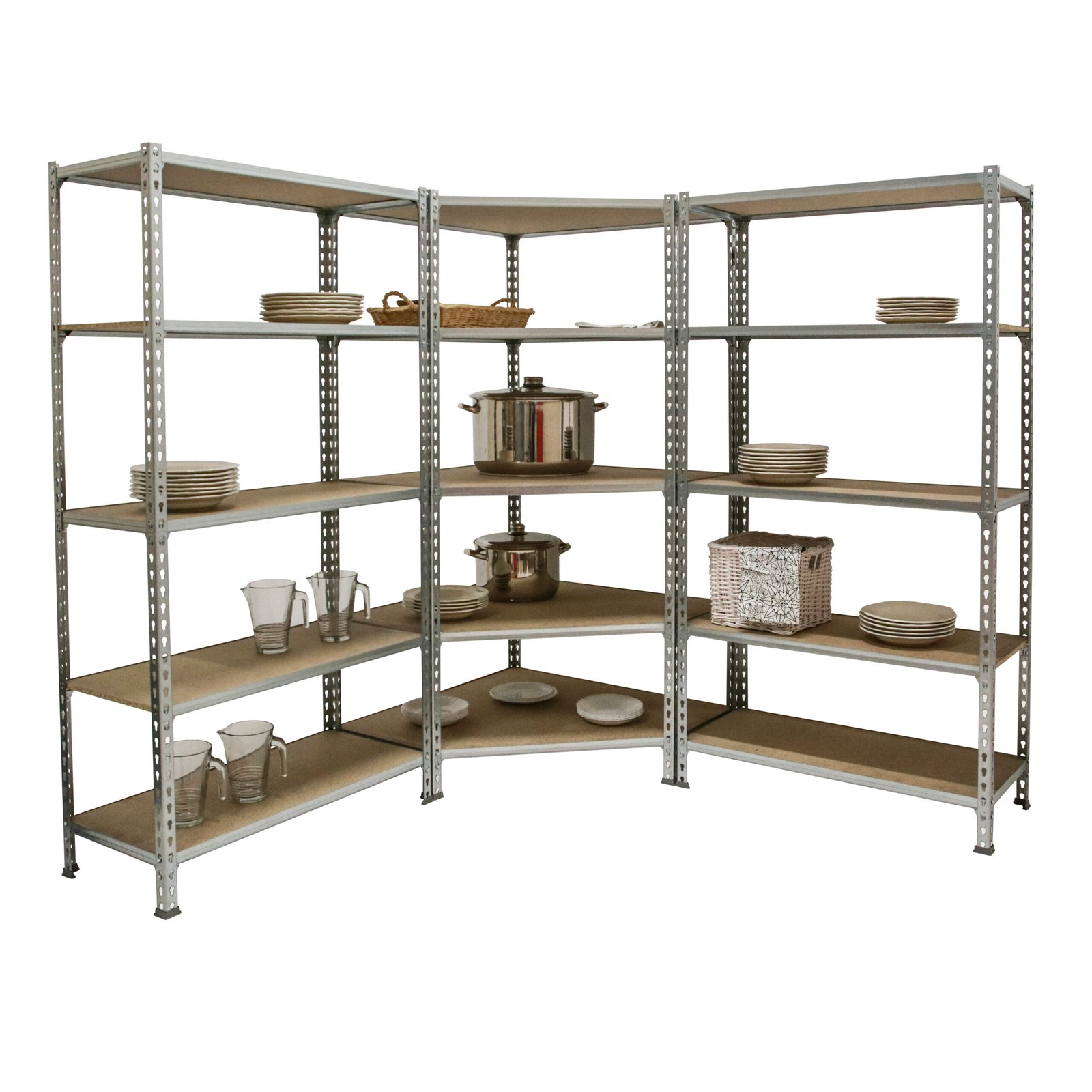Pack formado por Estanteria metalica esquinera sin tornillos con bandejas de aglomerado y 2 estanterias maderclick 5-300 con bandejas de aglomerado, de color GALVA/MADERA. La estanteria esquinera tiene un total de 5 estantes que soportan 200 kg cada uno de ellos, carga certificada a punto de flexion. Las dos estanterias maderclick 5-300 que van con ella tienen 5 estantes cada una y soportan 150 kg cada uno de los estantes. Incluye bandejas de aglomerado y 13 pies de plastico grises. Contiene perfiles partidos. Dimensiones de cada una de las 2 estanterias no esquineras (alto x ancho x fondo): 1800x900x300 mm. Montaje facil y rapido sin tornillos, con sistema click. Producto fabricado en Europa por Simonrack.