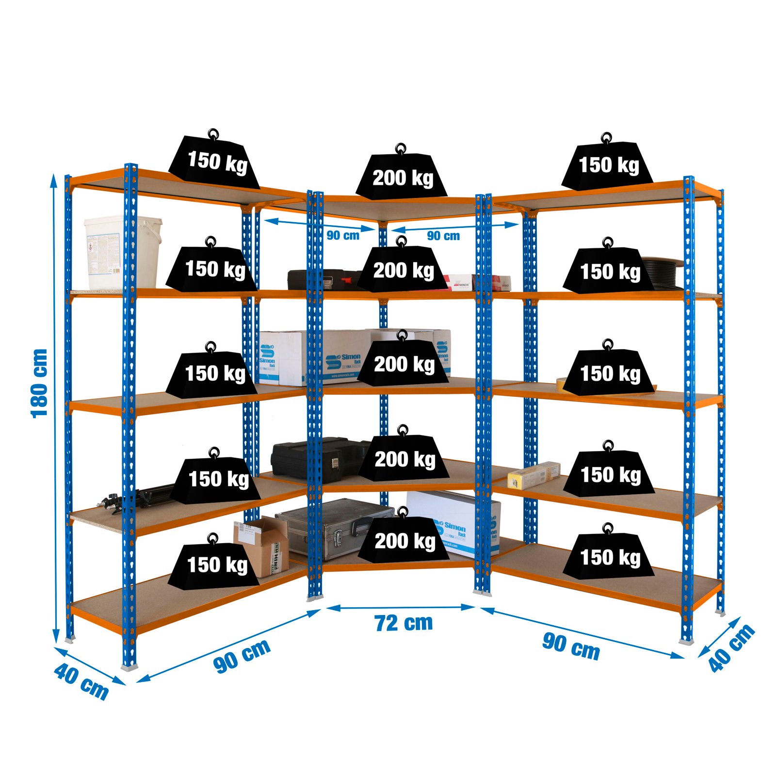 Pack formado por Estanteria metalica esquinera sin tornillos con bandejas de aglomerado y 2 estanterias maderclick 5-400 con bandejas de aglomerado, de color AZUL/NARANJA/MADERA. La estanteria esquinera tiene un total de 5 estantes que soportan 200 kg cada uno de ellos, carga certificada a punto de flexion. Las dos estanterias maderclick 5-400 que van con ella tienen 5 estantes cada una y soportan 150 kg cada uno de los estantes. Incluye bandejas de aglomerado y 13 pies de plastico blancos. Contiene perfiles partidos. Dimensiones de cada una de las 2 estanterias no esquineras (alto x ancho x fondo), 1800x900x400 mm. No se tambalea y no necesita anclaje a la pared. Montaje facil y rapido sin tornillos, con sistema click. Producto fabricado en Europa por Simonrack