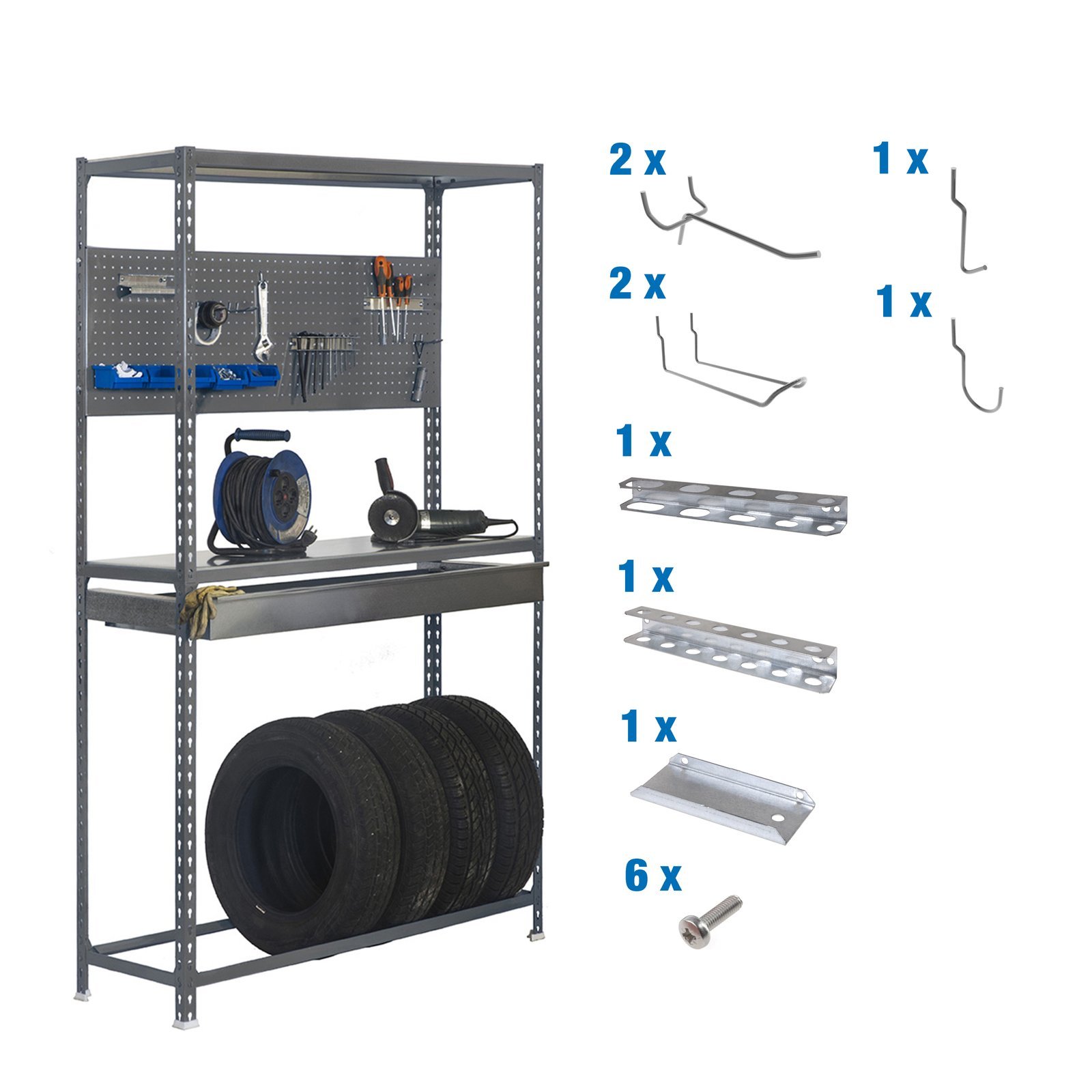 Estanteria metalica sin tornillos mas 9 accesorios de color gris. Con cajon. Tiene una capacidad de carga por estante de 180 kg. Con unas medidas en mm de 2000x1200x400. Fabricada en Europa por Simonrack y se monta rapido siguiendo las instrucciones